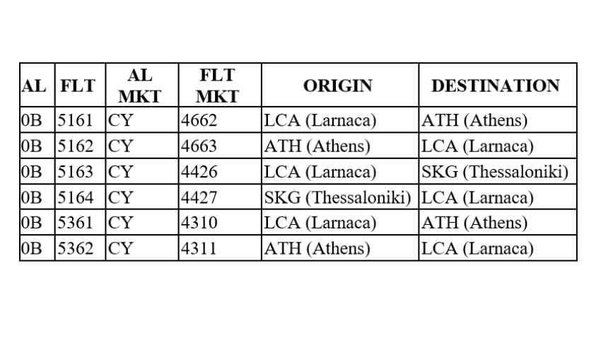 Εμπορικοί αριθμοί πτήσης της Blue Air για τις πτήσεις που εκτελούνται από τις Κυπριακές Αερογραμμές :