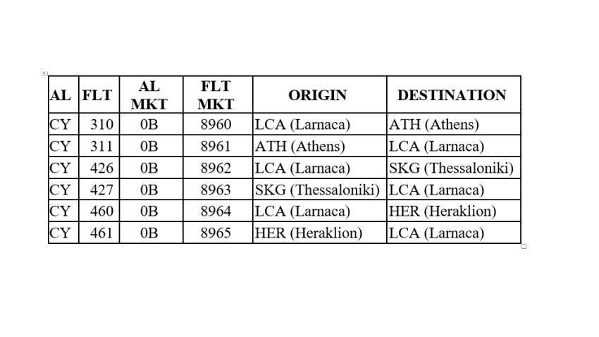 Η συνεργασία μεταξύ των δύο αεροπορικών εταιρειών θα επεκταθεί στο καλοκαιρινό πρόγραμμα, από τις 31 Μαρτίου έως τις 26 Οκτωβρίου 2019. Σύμφωνα με αυτή την συνεργασία , οι πελάτες των δύο αερογραμμών θα έχουν ενισχυμένη συνδεσιμότητα από τη Λάρνακα στην Αθήνα και τη Θεσσαλονίκη. Επιπλέον, η επέκταση της συμφωνίας θα φέρει μια νέα πτητική διαδρομή στη συνεργασία αυτή, από Λάρνακα προς Ηράκλειο.