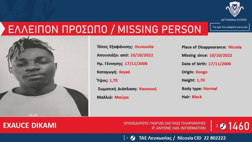 Η Αστυνομία ζητά πληροφορίες για εντοπισμό του EXAUCE DIKAMI, 16 ετών από το Κογκό, ο οποίος απουσιάζει από τον χώρο διαμονής του στη Λευκωσία από τις 10/10/2022.