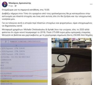 Νωρίτερα σήμερα και προτού μεταβεί στο Αρχηγείο Αστυνομίας για να δώσει την πρώτη του κατάθεση στην ανακριτική ομάδα που διερευνά τους ισχυρισμούς που διατυπώνει δημόσια, ο κύριος Δρουσιώτης υποστήριξε ότι κατέχει στοιχεία για μεταφορά χρημάτων από τον πρώην δικαστή Μιχαλάκη Χριστοδούλου στην επονομαζόμενη μάρτυρα «Σάντυ», μέσω τράπεζας και τεκμήρια για παραχώρηση μετρητών σε βαλίτσα και χαρτοκιβώτιο.