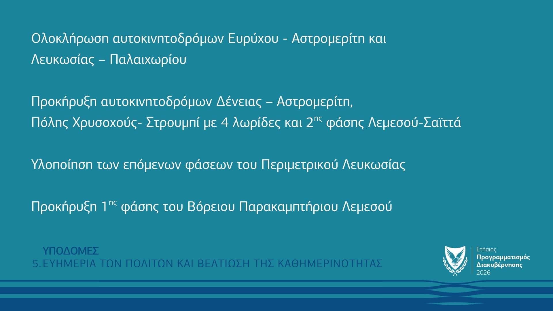 «Προκηρύσσουμε επίσης τους αυτοκινητόδρομους Δένειας προς Αστρομερίτη, Πόλης Χρυσοχούς προς Στρουμπί με 4 λωρίδες, και η 2η φάση του αυτοκινητόδρομου Λεμεσού προς Σαιττά».
