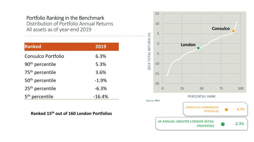 Σύμφωνα με την επίσημη αξιολόγηση της MSCI, οι επενδύσεις της Consulco σε εμπορικα ακίνητα, στο Λονδίνο, έχουν καταγράψει για την περιοδο 2011 – 2019 μέση καθαρή ετήσια απόδοση 11.1% για τους επενδυτές της.