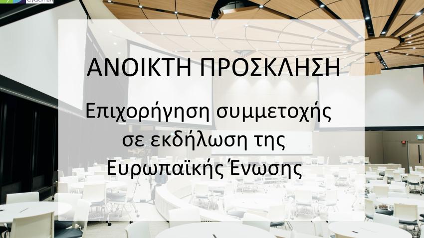 Στο πλαίσιο του Έργου LIFE14 CAP/CY/000006 Cyclamen Capacity Building, το Εθνικό Σημείο Επαφής προσκαλεί ενδιαφερόμενους να δηλώσουν ενδιαφέρον για επιχορήγηση συμμετοχής σε μια εκδήλωση της επιλογής τους, εντός της Ευρωπαϊκής Ένωσης, σχετικά με το περιβάλλον και την κλιματική αλλαγή. Η εκδήλωση μπορεί να είναι, μεταξύ άλλων, συνέδριο, εργαστήριο, σεμινάριο, network event κλπ.