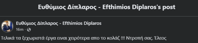 «Αγαπητές φίλες/λοι σας ενημερώνω ότι το πιο κάτω έργο που κοινοποιήθηκε μέσω του FACEBOOK και πολλοί με βρίζουν και με κατηγορούν, δεν είναι δικό μου έργο αλλά προϊόν κολλάς του Αντιπροέδρου του Δημοκρατικού Συναγερμού κύριου Ευθύμιου Δίπλαρου, ο οποίος έκοψε κομμάτια από διάφορα έργα μου και τα ένωσε, στην προσπάθεια του να δημιουργήσει εντυπώσεις.