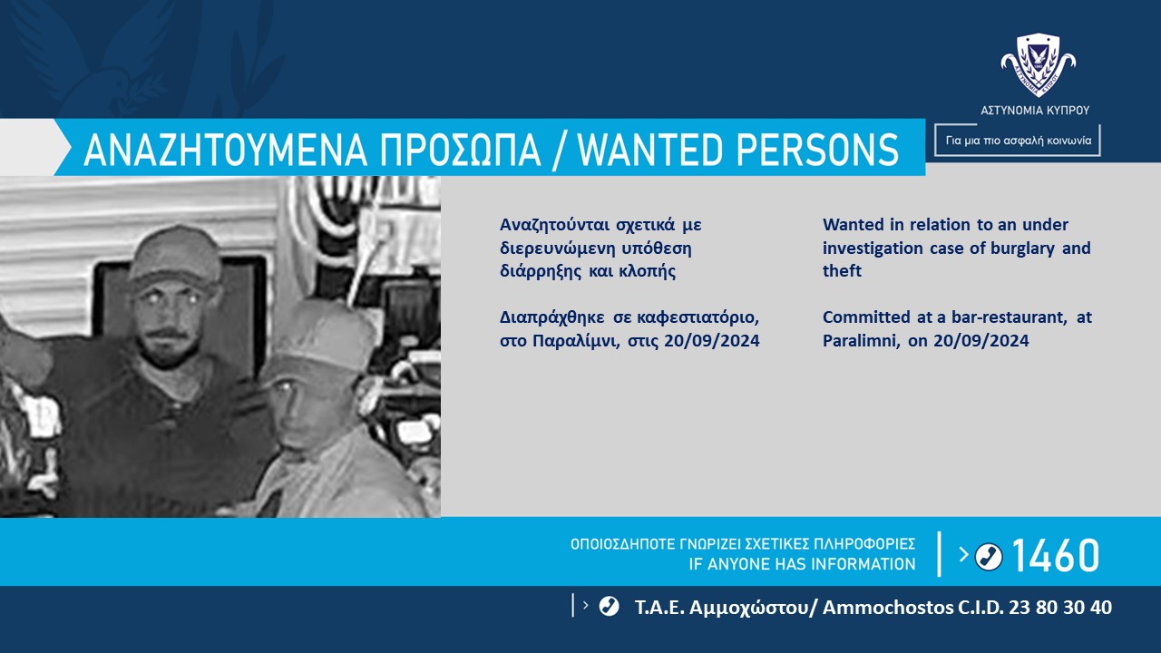 Παρακαλείται οποιοσδήποτε γνωρίζει οτιδήποτε που μπορεί να βοηθήσει στον εντοπισμό των αναζητούμενων προσώπων, να επικοινωνήσει με το ΤΑΕ Αμμοχώστου, στο τηλέφωνο 23-803040 ή με τη Γραμμή του Πολίτη, στον τηλεφωνικό αριθμό 1460 ή με τον πλησιέστερο Αστυνομικό Σταθμό.