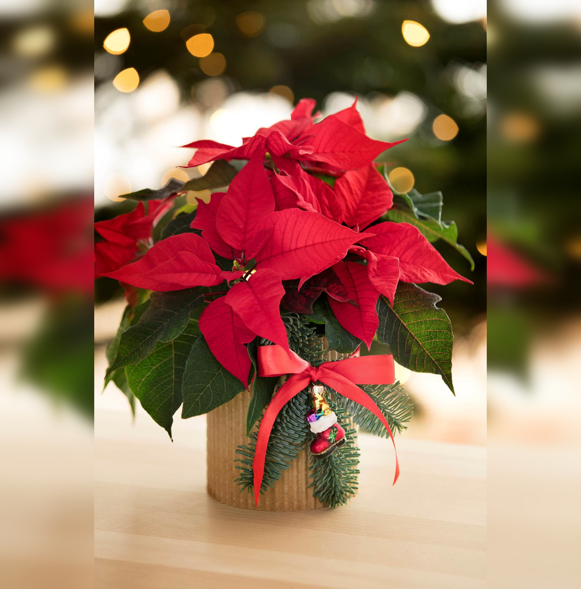 Για να μετατρέψετε ένα απλό αλεξανδρινό σε ένα μικρό προσωπικό δώρο, χρειάζεστε μια ξεχωριστή συσκευασία για να το απογειώσει. Στη φωτογραφία βλέπουμε μια γλάστρα με το κλασικό κόκκινο αλεξανδρινό, τυλιγμένο με το απλό, καφέ χαρτί περιτυλίγματος. Μπορείτε να προσθέσετε μερικά αξεσουάρ, όπως ένα κλαδί με μικρά κουκουνάρια και μερικά κλαδάκια από έλατο, τα οποία θα δέσετε με μια κόκκινη κορδέλα. Επίσης, για να γίνει το δώρο σας ακόμη πιο προσωπικό, μπορείτε να γράψετε τις ευχές σας απευθείας πάνω στο χαρτί. Να θυμάστε: Τα αλεξανδρινά αγαπούν τη ζέστη και οι θερμοκρασίες κάτω των 15 ° C και τα ρεύματα θα τα βλάψουν. Πριν μεταφέρετε τη σύνθεσή σας, βεβαιωθείτε ότι την έχετε τυλίξει καλά με μια εφημερίδα.