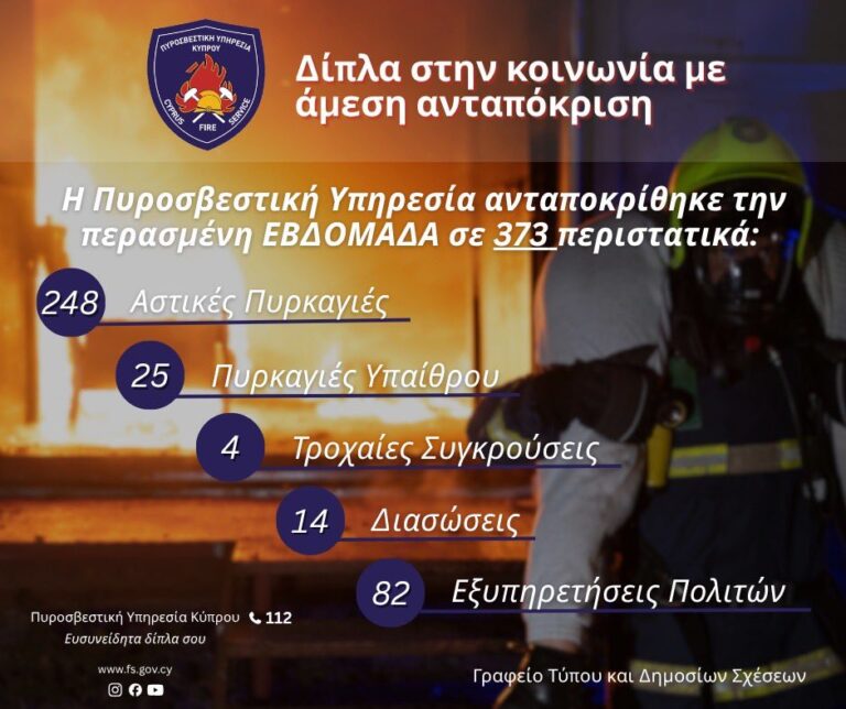 Η Πυροσβεστική Υπηρεσία κατά την εβδομάδα που μας πέρασε από τις 06:00 της Κυριακής 05/04/2026 μέχρι τις 06:00 της Κυριακής 12/04/2026 σε 373 περιστατικά.
