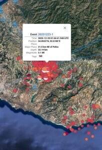 Σύμφωνα με σχετική ανακοίνωση, την Τρίτη 23 Δεκεμβρίου 2025 και τοπική ώρα 03:45 καταγράφηκε από το σεισμολογικό δίκτυο του Τμήματο,ς σεισμός μεγέθους 3.1 βαθμών στην κλίμακα Ρίχτερ.
