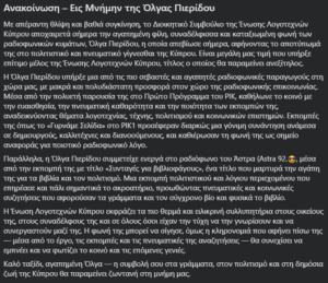 «Με βαθιά θλίψη και ειλικρινή συγκίνηση, η οικογένεια των ηθοποιών της Κύπρου αποχαιρετά σήμερα μια εμβληματική μορφή των γραμμάτων και του πολιτισμού μας, την Όλγα Πιερίδου.