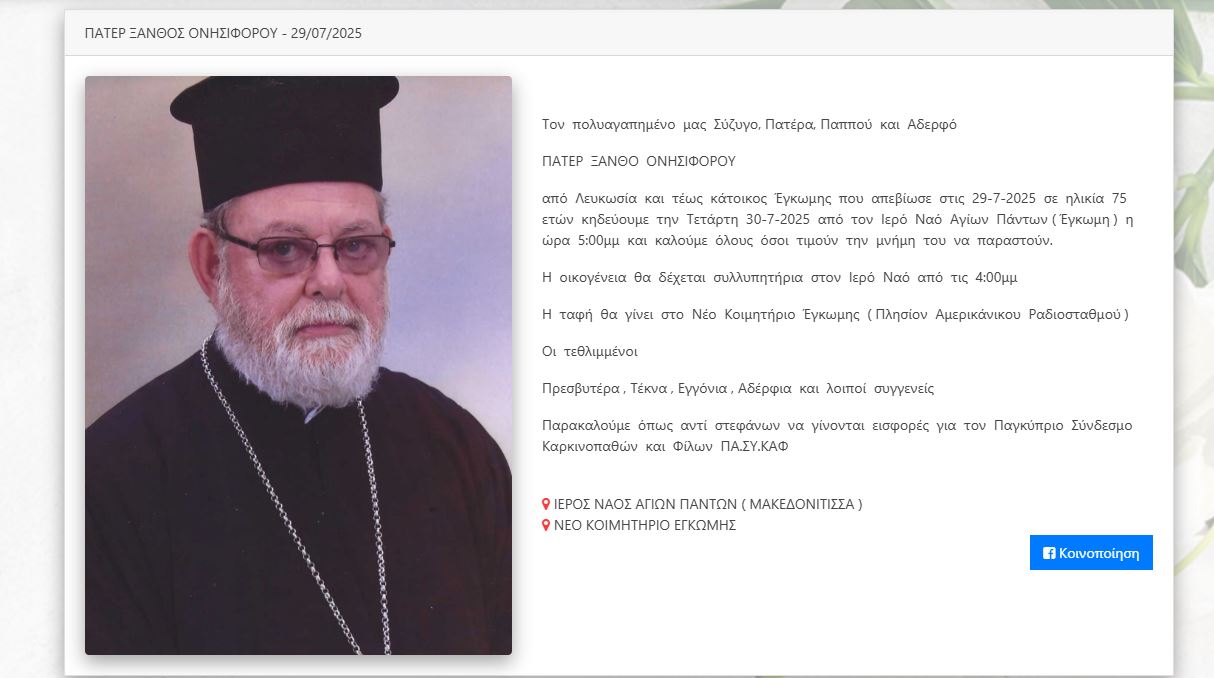 Η εξόδιος Ακολουθία για τον πάτερ Ξάνθο θα ψαλεί την Τετάρτη 30-7-2025 από τον Ιερό Ναό Αγίων Πάντων ( Έγκωμη ) η ώρα 5:00μμ.
