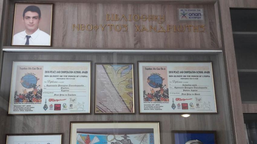 Να πάρουμε τα γεγονότα με τη σειρά. Στο πλαίσιο του 6ου ΟΠΑΠ All Star Day που έγινε στις 17 Δεκεμβρίου, 2016 η ΟΠΑΠ Κύπρου απένειμε το θεσμοθετημένο βραβείο «Νεόφυτος Χανδριώτης» στο Γυμνάσιο Παναγίας Θεοσκέπαστης Πάφου για την παγκόσμια διάκριση του με το έργο «Δον Κιχώτης». Το βραβείο, αφιερωμένο στη μνήμη του άριστου καλαθοσφαιριστή και φοιτητή Νεόφυτου Χανδριώτη, ο οποίος έφυγε από τη ζωή στα 22 του χρόνια, συγκίνησε αλλά και ενέπνευσε τους μαθητές και τους καθηγητές τους. Ετσι, χρησιμοποιώντας το χρηματικό ποσό του βραβείου τους σαν προζύμι, έφτιαξαν στο σχολείο τους βιβλιοθήκη, την οποία με τη σειρά τους αφιέρωσαν στο Νεόφυτο Χανδριώτη. Τον νέο που έγινε και για αυτούς, πρότυπο ήθους και θέλησης.