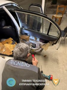 Κατά τον έλεγχο του οχήματος διαπιστώθηκε ότι ανάμεσα στις πόρτες και πίσω από το μπροστινό και πισινό προφυλακτήρα υπήρχαν επιμελώς κρυμμένες μεγάλες ποσότητες καπνικών προϊόντων.