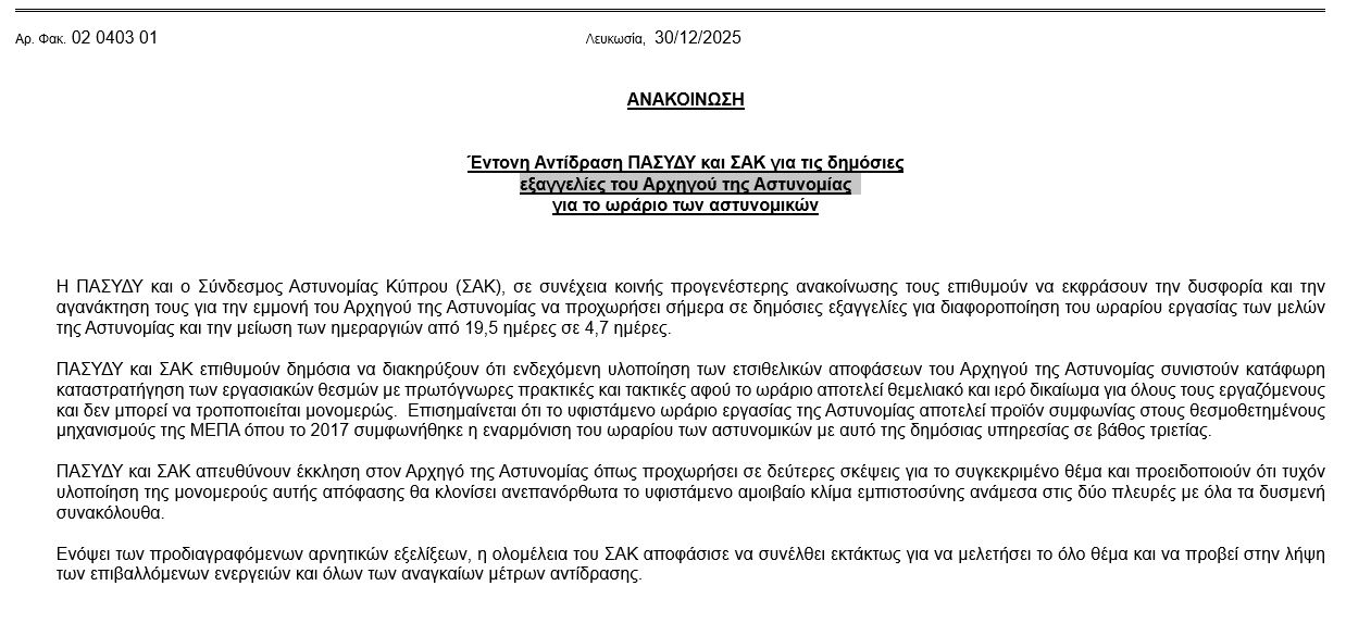 «Επισημαίνεται ότι το υφιστάμενο ωράριο εργασίας της Αστυνομίας αποτελεί προϊόν συμφωνίας στους θεσμοθετημένους μηχανισμούς της ΜΕΠΑ όπου το 2017 συμφωνήθηκε η εναρμόνιση του ωραρίου των αστυνομικών με αυτό της δημόσιας υπηρεσίας σε βάθος τριετίας. ΠΑΣΥΔΥ και ΣΑΚ απευθύνουν έκκληση στον Αρχηγό της Αστυνομίας όπως προχωρήσει σε δεύτερες σκέψεις για το συγκεκριμένο θέμα και προειδοποιούν ότι τυχόν υλοποίηση της μονομερούς αυτής απόφασης θα κλονίσει ανεπανόρθωτα το υφιστάμενο αμοιβαίο κλίμα εμπιστοσύνης ανάμεσα στις δύο πλευρές με όλα τα δυσμενή συνακόλουθα.»