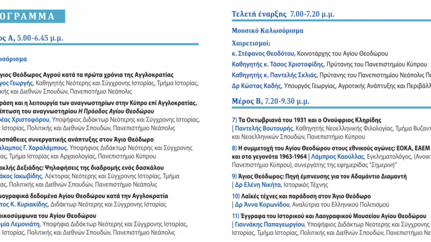 Μεταξύ άλλων, κατά την ημερίδα, διακεκριμένοι επιστήμονες θα μιλήσουν, θα αναλύσουν και θα συζητήσουν για την ιστορία του Άγιου Θεοδώρου κατά τα πρώτα χρόνια της Αγγλοκρατίας, τη δράση των αναγνωστηρίων στην Κύπρο επί Αγγλοκρατίας, τη συμμετοχή που είχε ο Άγιος Θεόδωρος στους Εθνικούς αγώνες ΕΟΚΑ, ΕΑΕΜ και στα γεγονότα 1963-64, όπως και διάφορα άλλα ζητήματα που απασχόλησαν την περιοχή.