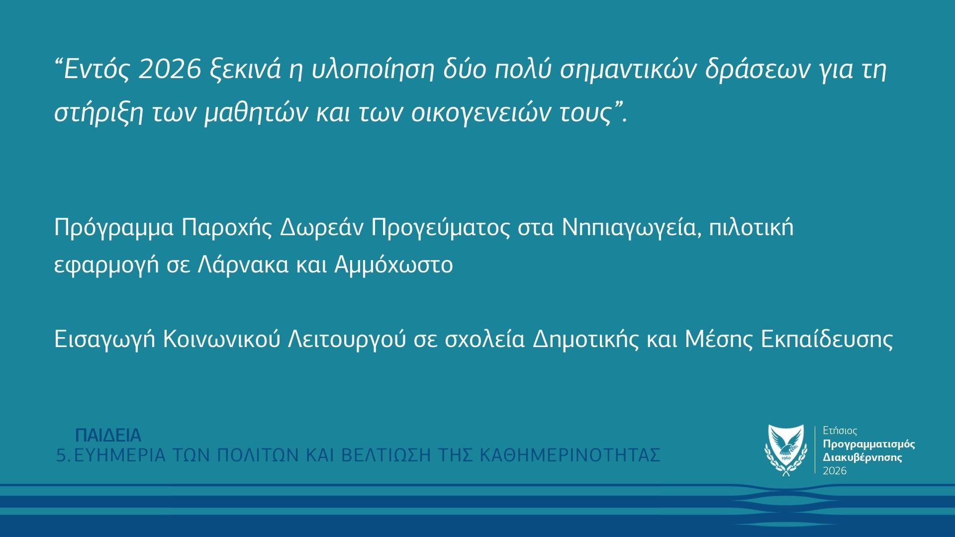 Ο Πρόεδρος της Δημοκρατίας ανακοίνωσε ότι εντός του 2026 ξεκινά και η υλοποίηση δύο πολύ σημαντικών δράσεων που στοχεύουν στη στήριξη των μαθητών και των οικογενειών τους.