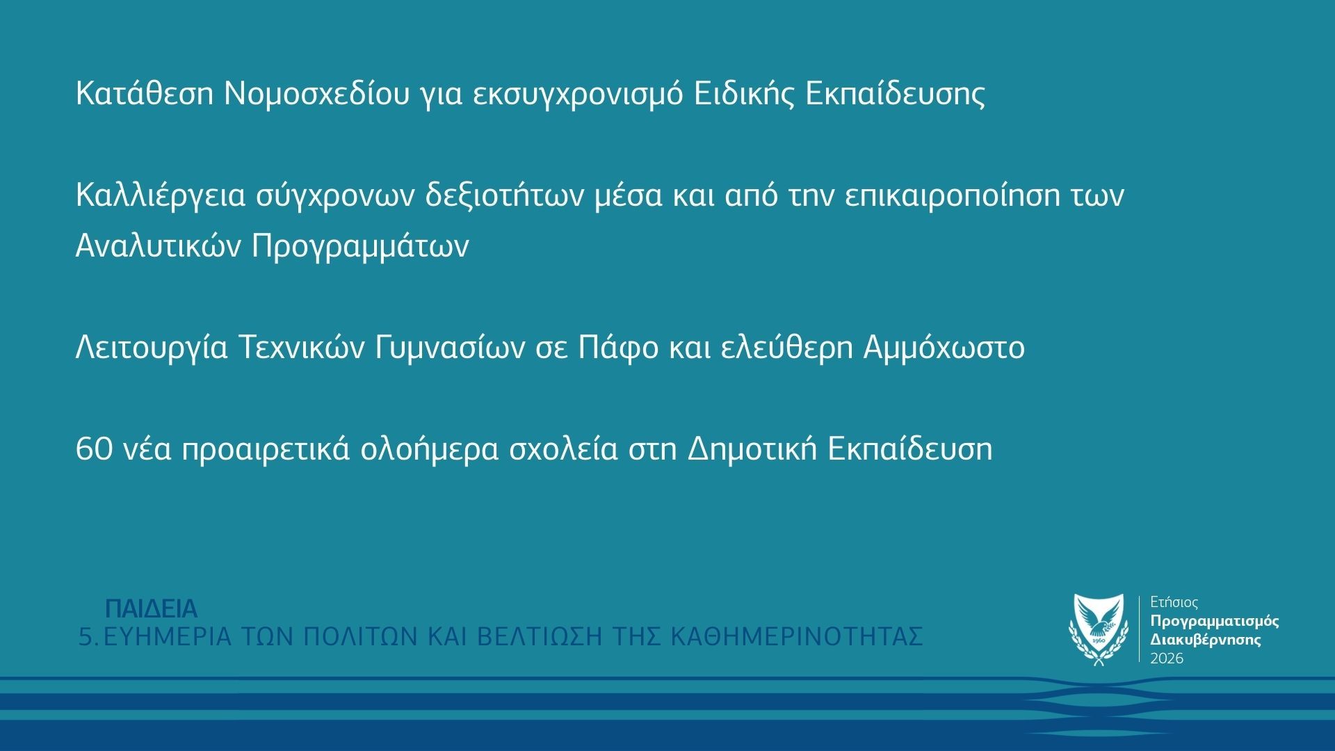 - Συνεχίζεται η αναβάθμιση της Τεχνικής και Επαγγελματικής Εκπαίδευσης, με την επέκταση του θεσμού του Τεχνικού Γυμνασίου, πέραν από τη Λευκωσία και Λεμεσό, σε Πάφο και ελεύθερη Αμμόχωστο. Η καινοτομία του Τεχνικού Γυμνασίου, καθώς και η επαναφορά, μετά από 13 χρόνια, της εβδομάδας εργασίας, ενισχύουν τη διασύνδεση της εκπαίδευσης με την αγορά εργασίας.