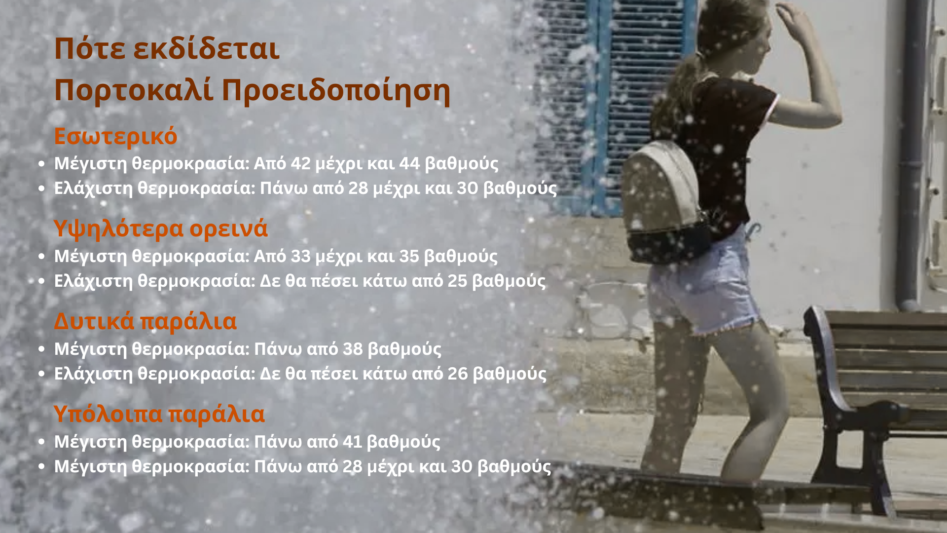 - Όταν εκδίδεται πορτοκαλί προειδοποίηση διακόπτονται όλες οι υπαίθριες βαριές και μέτριες εργασίες μεταξύ των ωρών 12:00-16:00, εφόσον βρίσκεται σε ισχύ η προειδοποίηση.