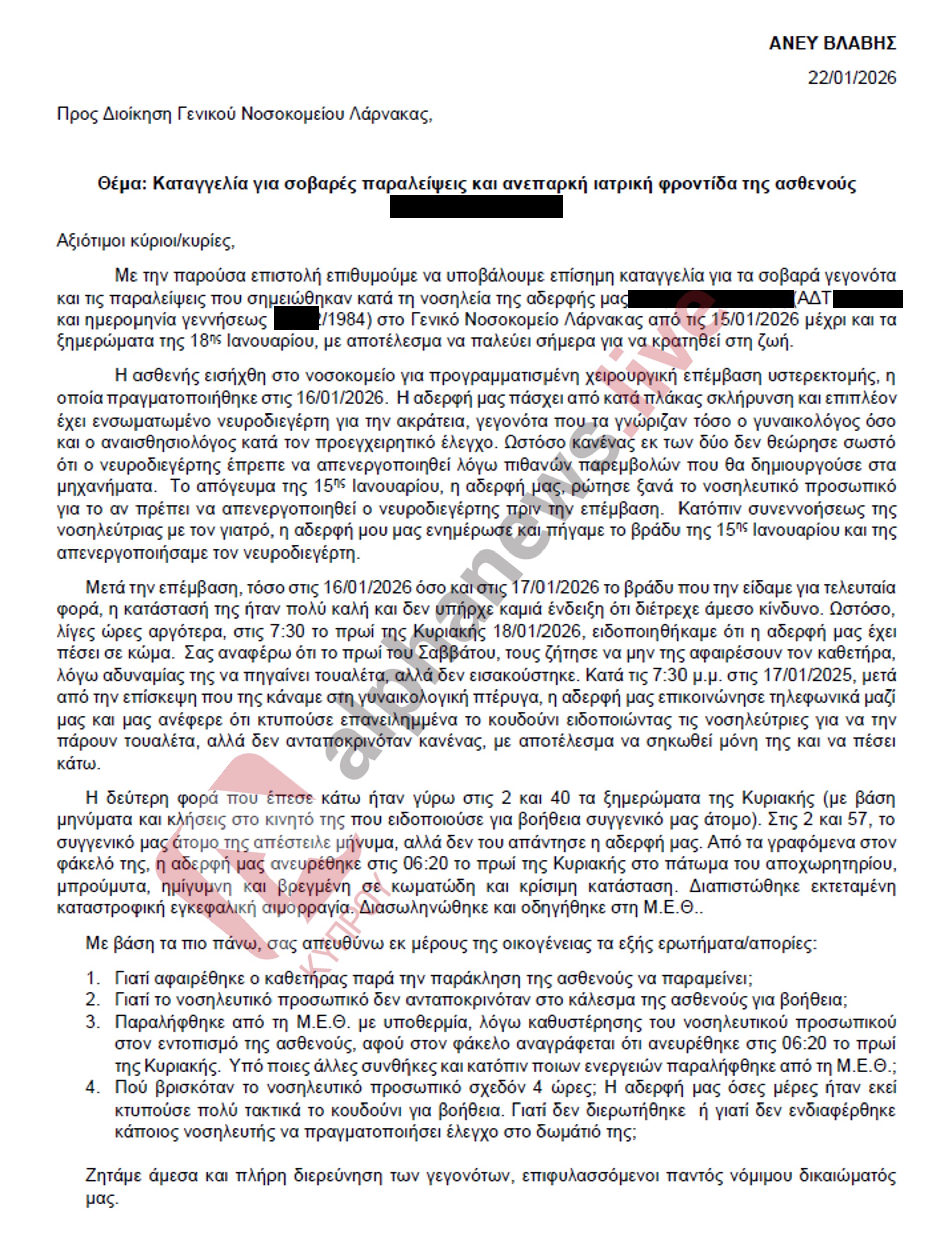 Υπενθυμίζεται ότι ο ΟΚΥπΥ είχε δώσει οδηγίες για διερεύνηση του περιστατικού. Η 42χρονη ασθενής έπασχε από κατά πλάκα σκλήρυνση, και νοσηλευόταν σε κωματώδη κατάσταση έπειτα από επέμβαση υστερεκτομής, με την οικογένειά της να απευθύνει επιστολή προς τη διεύθυνση του νοσηλευτηρίου παραθέτοντας τα γεγονότα τα οποία οδήγησαν στην επιδείνωση της κατάστασης της υγείας της.