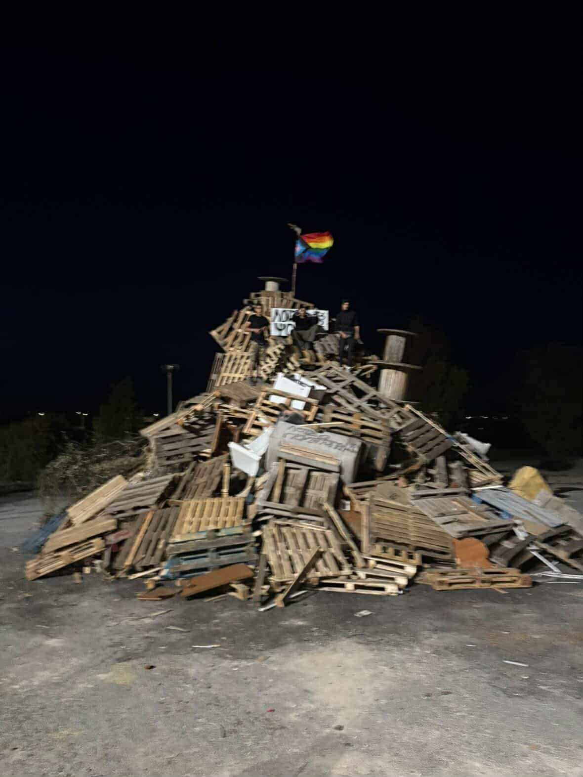 Όπως φαίνεται και στις πιο κάτω φωτογραφίες και βίντεο, στην κορυφή των αμέτρητων ξύλων που τοποθέτησαν, έχουν βάλει σημαία των ΛΟΑΤΚΙ αναγράφοντας αισχρό μήνυμα μίσους.