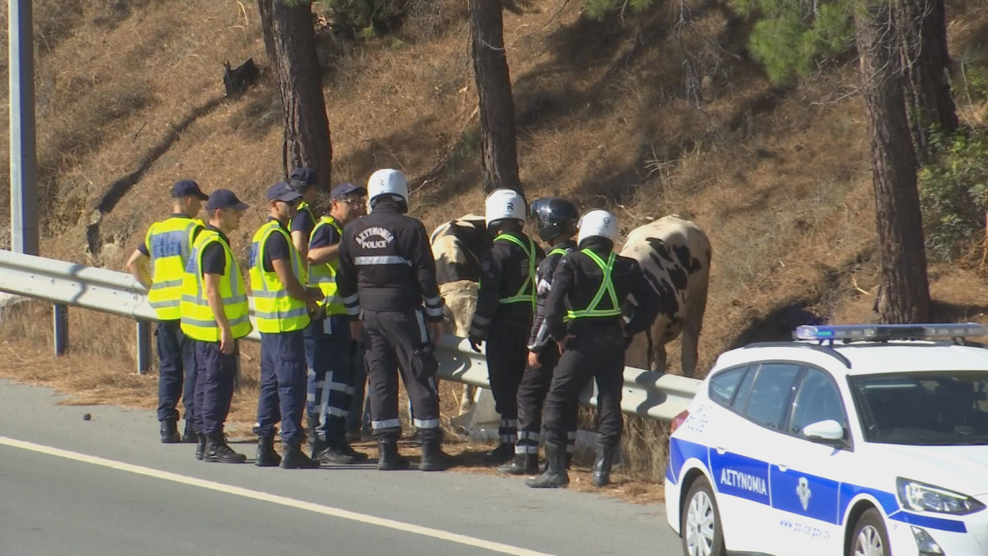 Αμέσως έσπευσαν στο σημείο μέλη της Αστυνομίας, των Κτηνιατρικών Υπηρεσιών αλλά και του Τμήματος Επιθεώρησης Εργασίας για εξετάσεις και για περιορισμό των ζώων εκτός δρόμου, με σκοπό την απομάκρυνσή τους.