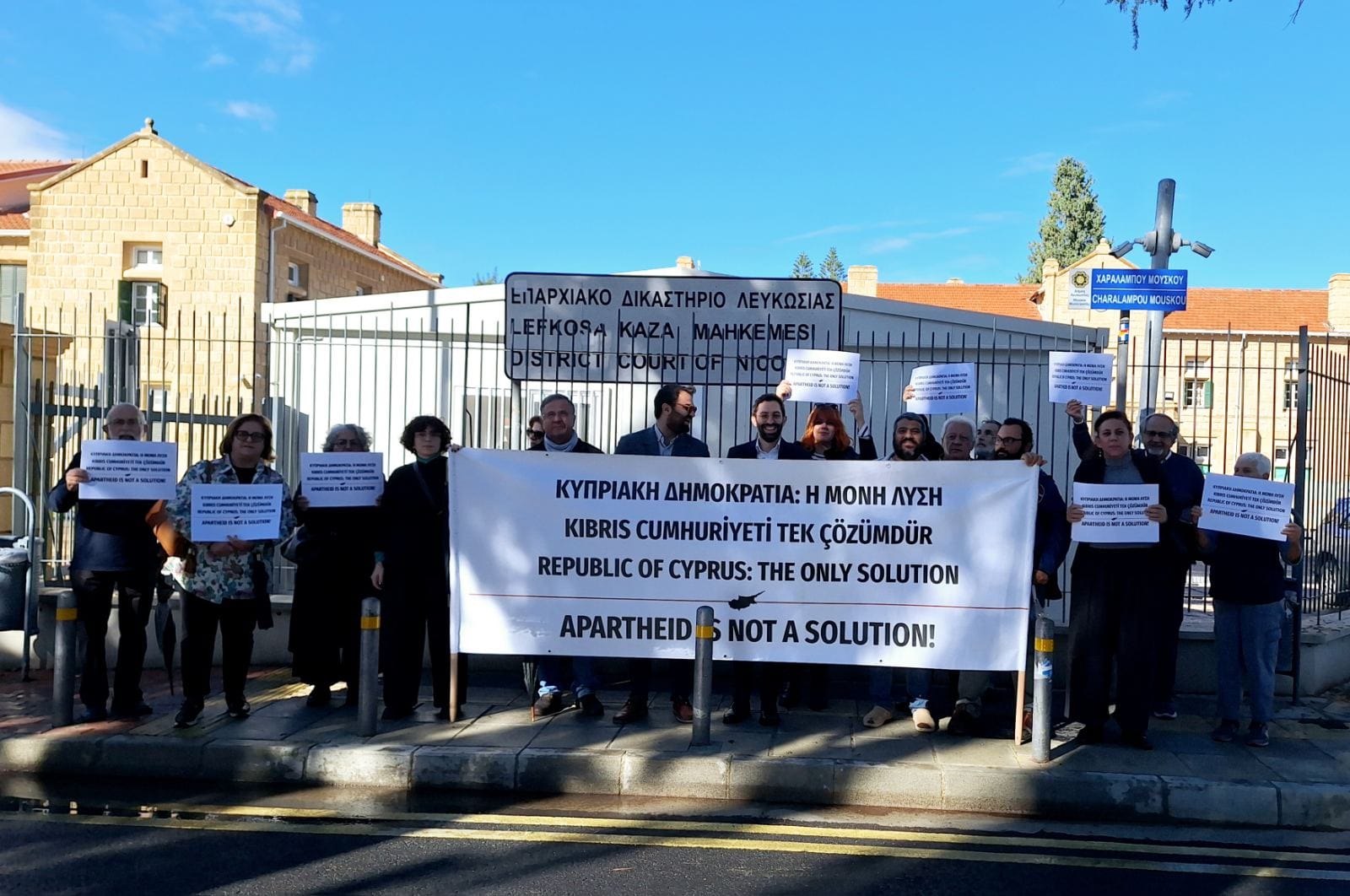 Παρόντες στη διαδικασία στο Επαρχιακό Δικαστήριο ήταν φίλοι και υποστηρικτές των δύο κατηγορουμένων, καθώς και ο Πρόεδρος του Κινήματος Οικολόγων Γιώργος Περδίκης και ο Αντιπρόεδρος Κυριάκος Τσιμίλλης, οι οποίοι ανήρτησαν έξω από τον χώρο του δικαστηρίου και το πανό με το σύνθημα «Κυπριακή Δημοκρατία: Η μόνη λύση» και “Apartheid is not a solution” που είχαν προσπαθήσει να αναρτήσουν στην παρέλαση οι Τάττης και Καραχάν.