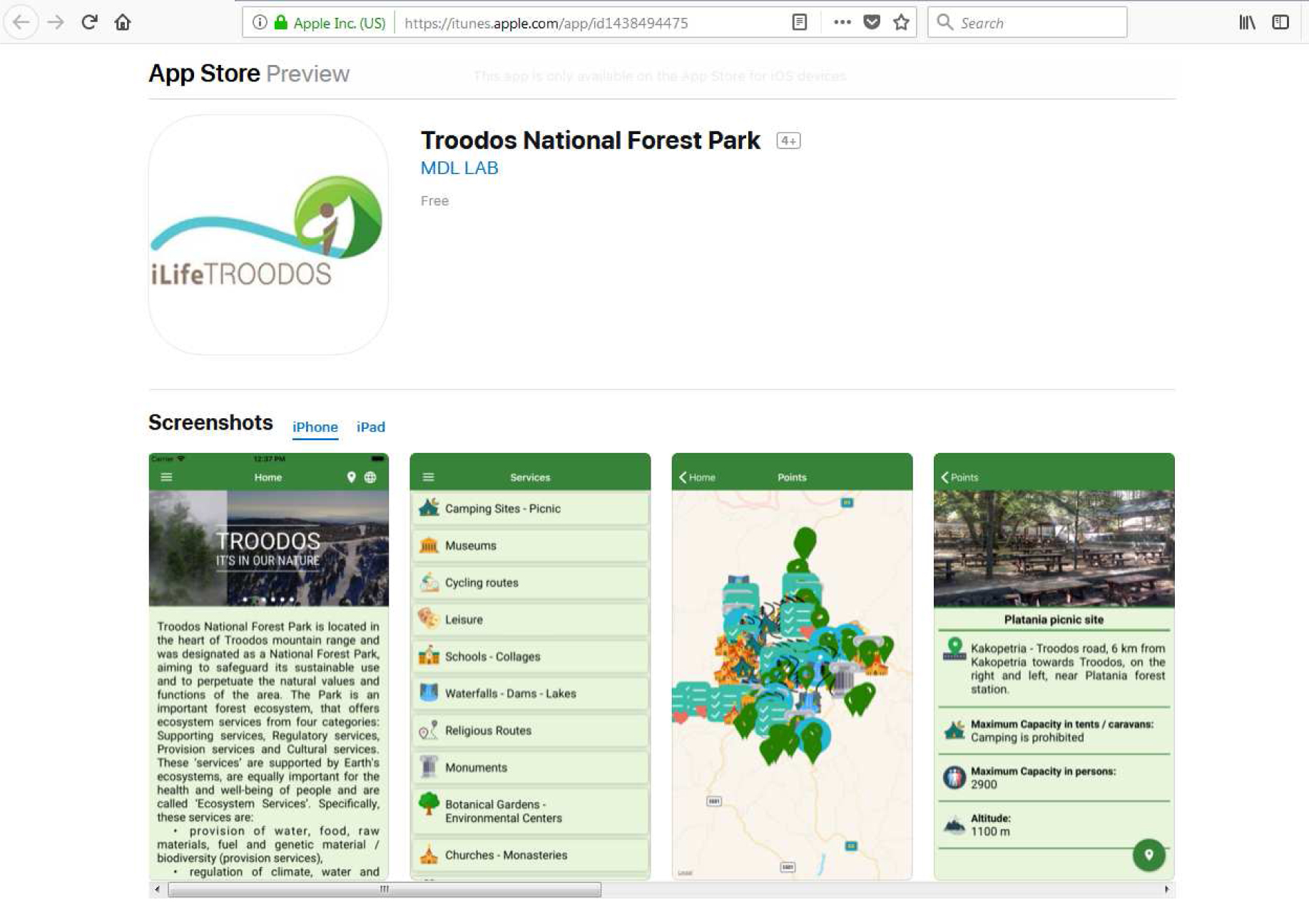 Οι ερευνητικές μονάδες του Πανεπιστημίου Frederick, το Εργαστήριο Κινητών Συσκευών (MDL) και η Μονάδα Διατήρησης της Φύσης (NCU), στο πλαίσιο του έργου iLIFE–TROODOS και σε συνεργασία με τους εταίρους του έργου (Τμήμα Δασών, Τμήμα Περιβάλλοντος και Contact Advertising Agency Ltd), δημιούργησαν την εφαρμογή ‘Troodos National Forest Park (iLIFE-TROODOS)’.