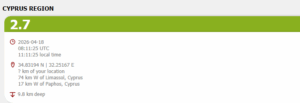 🔔#Earthquake (#σεισμός) M2.7 occurred 17 km NW of #Paphos (#Cyprus) 43 min ago (local time 11:11:25). More info at: