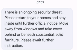 «Υπάρχει συνεχιζόμενη απειλή ασφαλείας. Παρακαλείστε να επιστρέψετε στα σπίτια σας και να παραμείνετε μέσα μέχρι νεότερης επίσημης ανακοίνωσης. Απομακρυνθείτε από τα παράθυρα και καλυφθείτε πίσω ή κάτω από στιβαρά, συμπαγή έπιπλα. Παρακαλείστε να αναμένετε περαιτέρω οδηγίες».