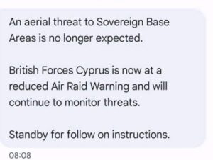 «Η εναέρια απειλή προς τις Κυρίαρχες Βάσεις δεν αναμένεται πλέον. Οι Βρετανικές Δυνάμεις Κύπρου βρίσκονται πλέον σε μειωμένο επίπεδο Προειδοποίησης Αεροπορικής Επιδρομής και θα συνεχίσουν να παρακολουθούν τις απειλές. Παραμείνετε σε αναμονή για επόμενες οδηγίες».