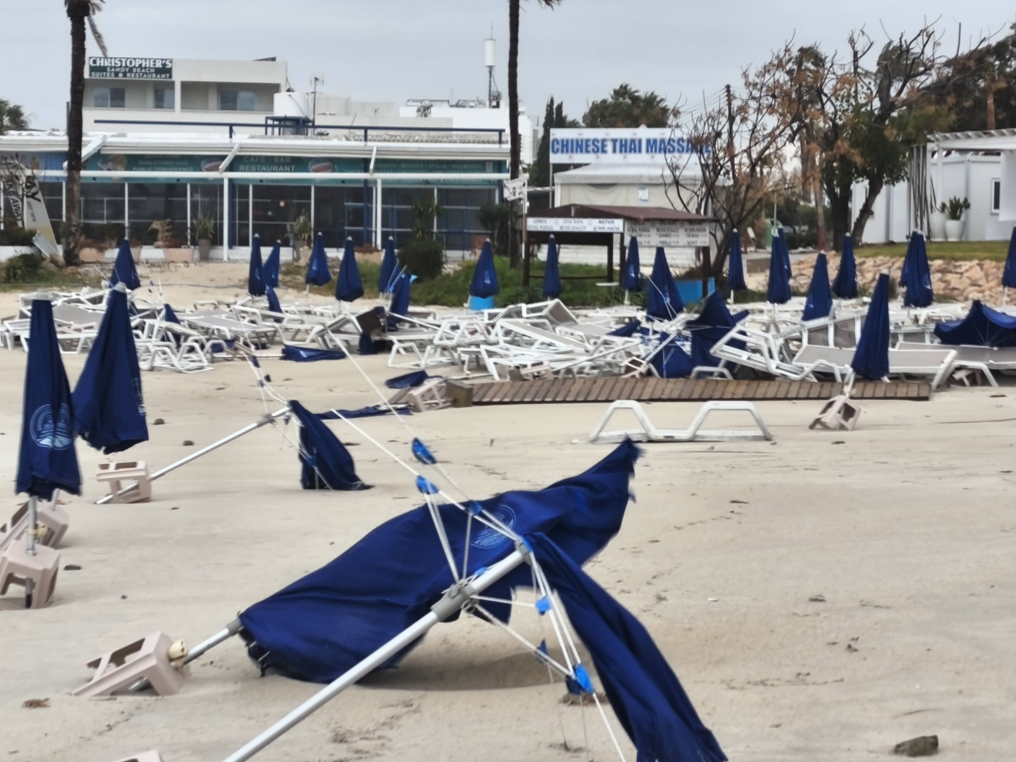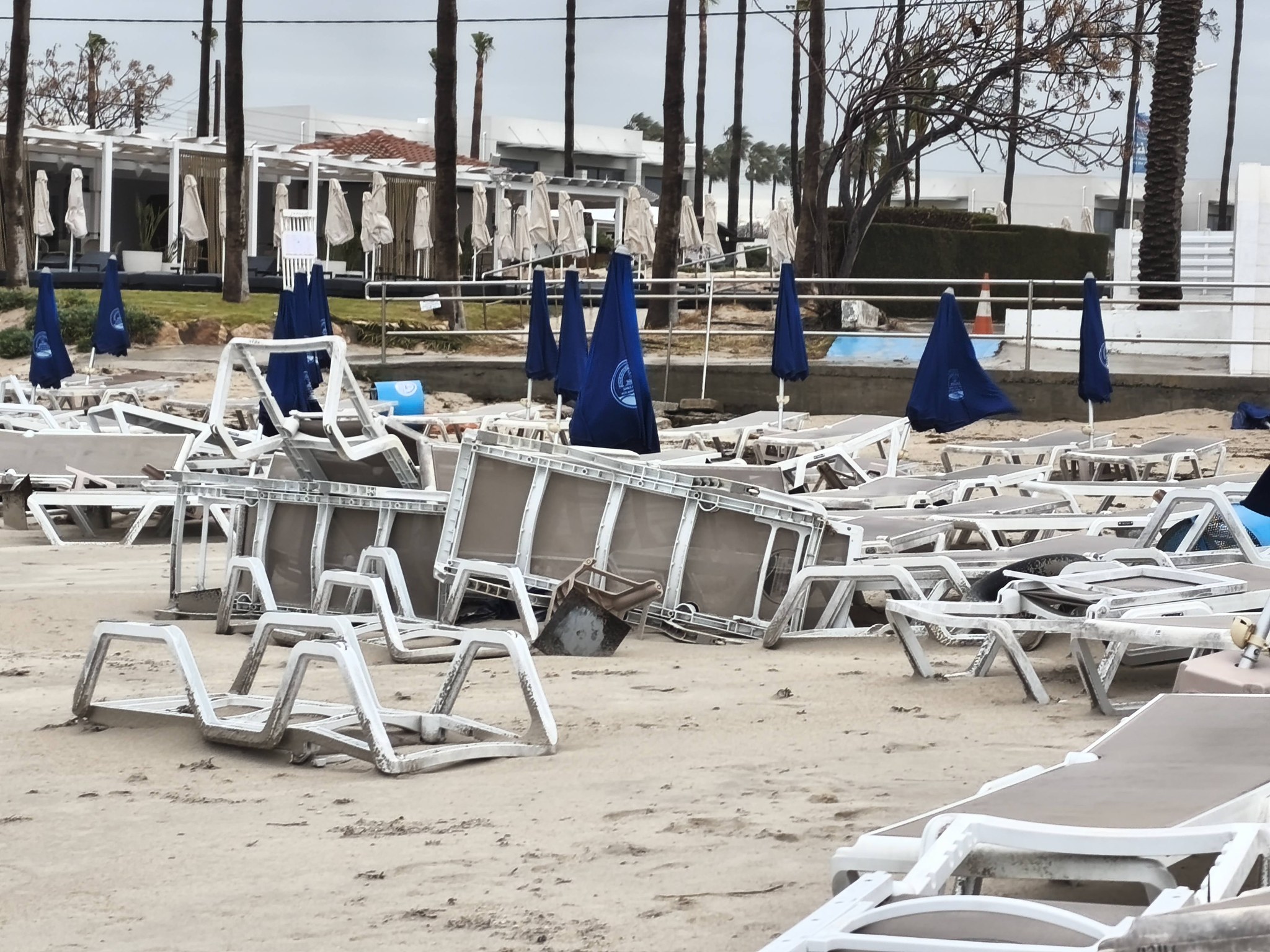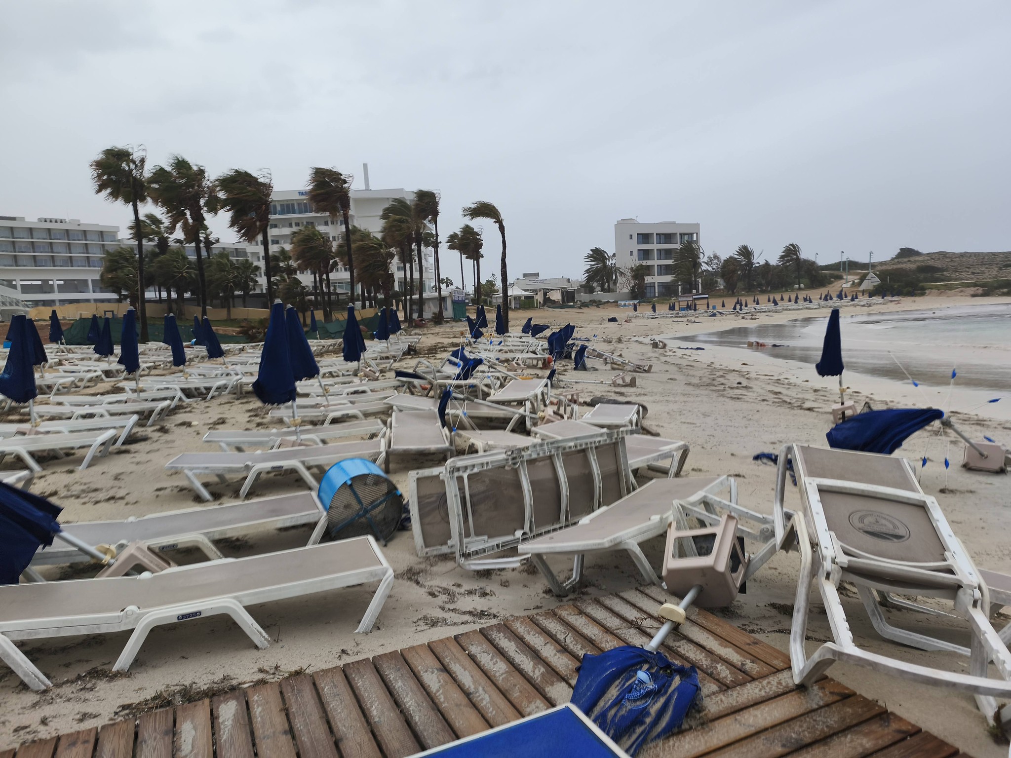 Στην επαρχία Αμμοχώστου σοβαρές καταστροφές προκλήθηκαν σε παραθαλάσσιες περιοχές, όπως η Αγία Νάπα όπου παρασύρθηκαν κρεβατάκια και ομπρέλες σε παραλίες.