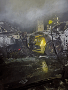 Η φωτιά εκδηλώθηκε γύρω στις 2:45 τα ξημερώματα, ενώ σύμφωνα με τον εκπρόσωπο Τύπου της Πυροσβεστικής, από αυτήν τέσσερα οχήματα και τρία ηλεκτρικά αμαξίδια για γκολφ έπαθαν εκτεταμένες ζημιές.