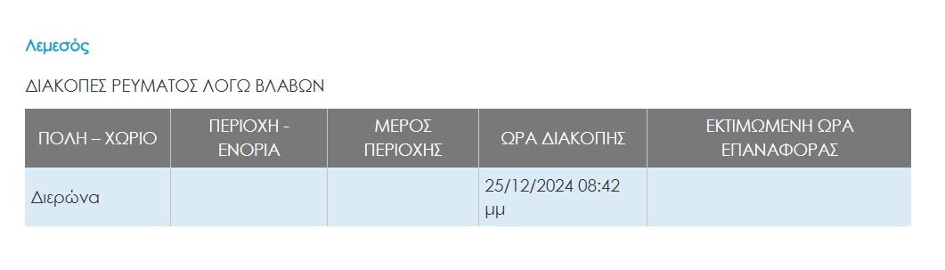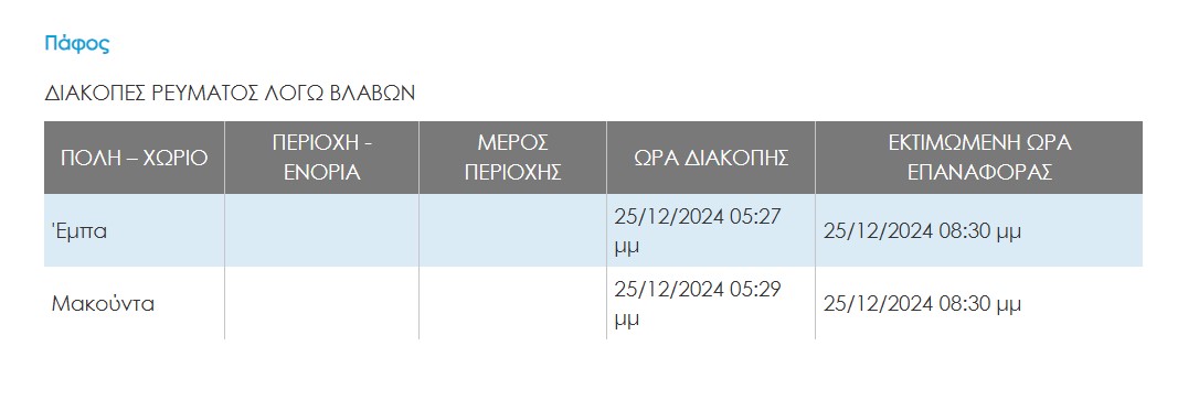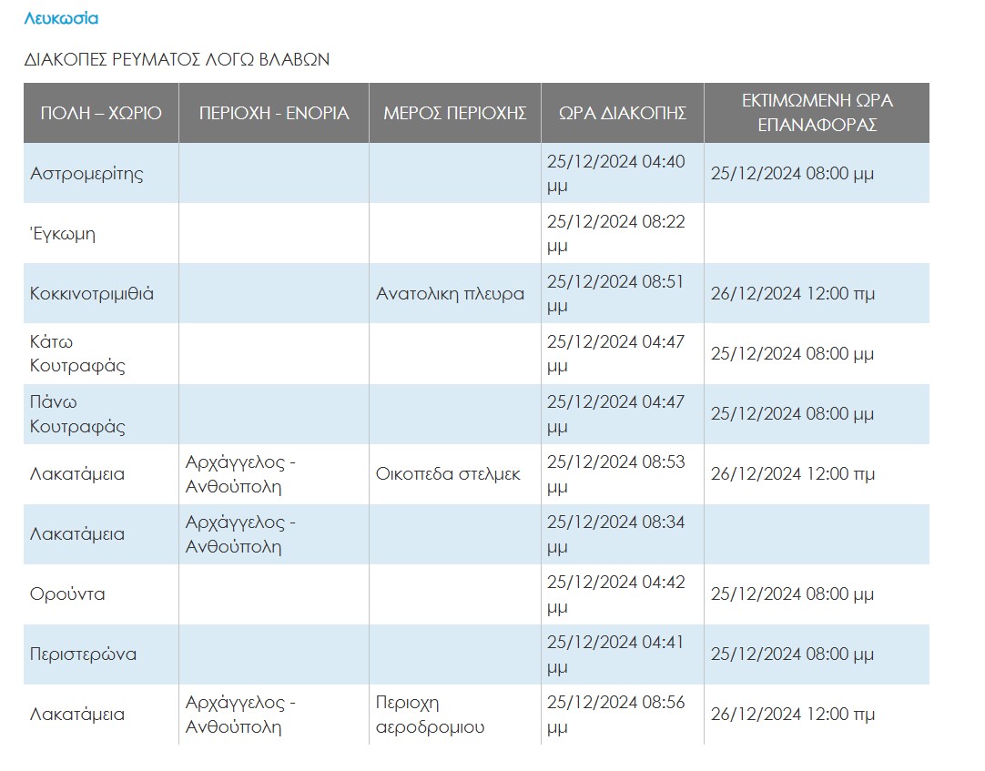 Το έργο της ΑΗΚ με τις δεδομένες καιρικές συνθήκες είναι δύσκολο, ωστόσο με την πρώτη ευκαιρία, τα συνεργεία θα επιχειρήσουν για εντοπισμό και επιδιόρθωση όλων των βλαβών.