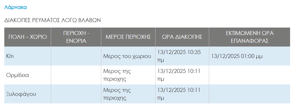 Χωρίς ρεύμα λόγω βλάβης στο δίκτυο της ΑΗΚ έχουν μείνει περιοχές της επαρχίας Λάρνακας.