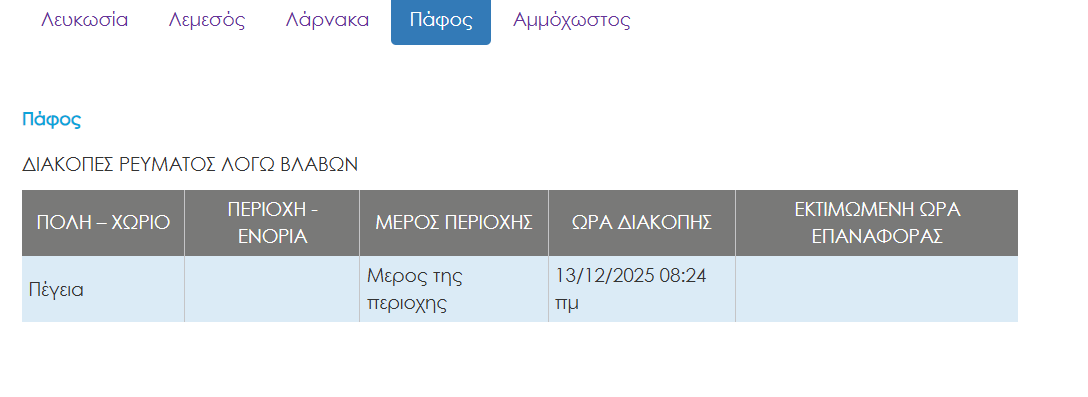 Πρόβλημα από νωρίς το πρωί λόγω βλάβης, αντιμετωπίζει και μέρος της περιοχής στην Πέγεια, στην επαρχία Πάφου.