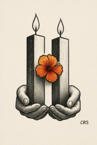 «Δύο κεριά, όρθια σαν τους Δίδυμους Πύργους, στέκονται μέσα σε χέρια που τα κρατούν τρυφερά, σαν μνήμη που δεν αφήνεται να χαθεί. Στο κέντρο τους, εκεί όπου άλλοτε γεννήθηκε ο πόνος, αναδύεται ένα λουλούδι. Όχι σαν φωτιά, αλλά σαν άνθισμα∙ μια έκρηξη ζωής, χρωματιστή, μέσα από το σκοτάδι.