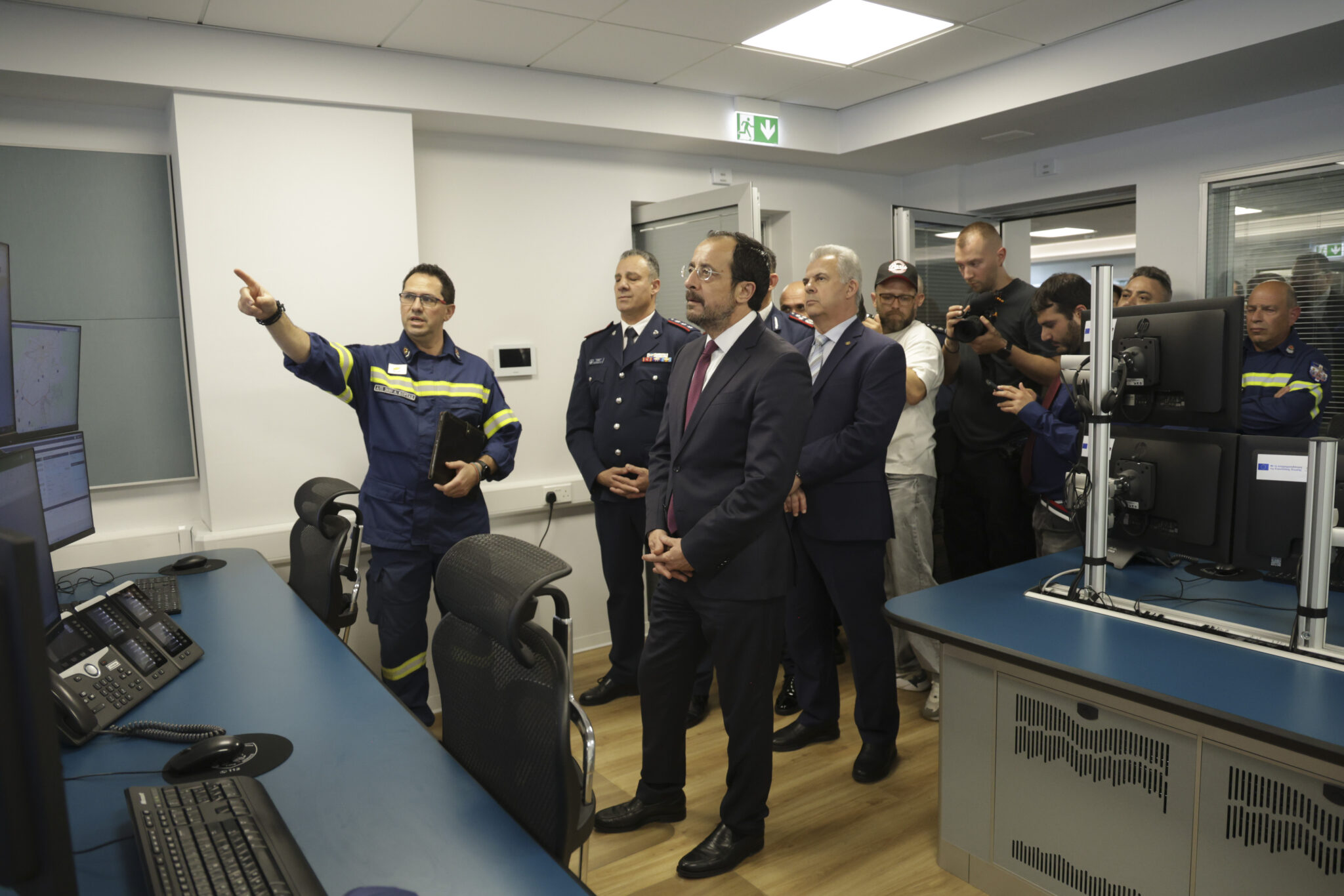 Ο Πρόεδρος της Δημοκρατίας ξεναγήθηκε στις αίθουσες του ΕΣΚΕΠΥ, όπου υπάρχουν υποδομές για τη λειτουργία 14 γραμμών επικοινωνίας. Όπως αναφέρθηκε στον Πρόεδρο, στην παρούσα φάση το Κέντρο λειτουργεί με βάρδιες των έξι ατόμων και μπορούν να κληθούν έως και 12 μέλη της δύναμης για τη στελέχωσή του, εάν παραστεί ανάγκη. Με τη συμβολή του, θα υπάρχει πιο άμεση κινητοποίηση δυνάμεων, με πιο σαφείς πληροφορίες, και δε θα χάνονται κλήσεις, όπως αναφέρθηκε κατά την ξενάγηση στον Πρόεδρο.