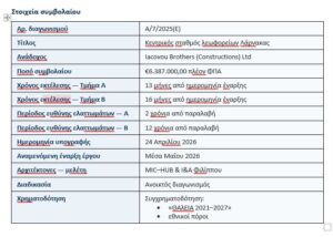 Η σύμβαση ανατέθηκε κατόπιν ανοικτού διαγωνισμού. Η συνολική δαπάνη ανέρχεται σε €6.387.000 συν Φ.Π.Α. Η έναρξη του έργου αναμένεται περί τα μέσα Μαΐου 2026.