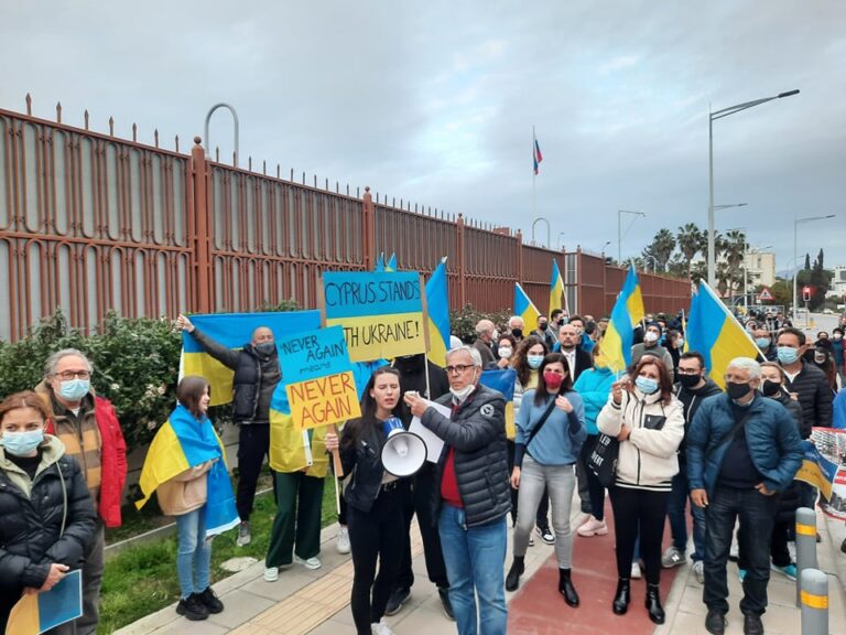 Κρατώντας ουκρανικές σημαίες και φωνάζοντας συνθήματα κατά της ρωσικής εισβολής τόσο στα ελληνικά όσο και στα ουκρανικά, εκατοντάδες πολίτες, πραγματοποιούν εκδήλωση διαμαρτυρίας έξω από τη ρωσική Πρεσβεία στη Λευκωσία.