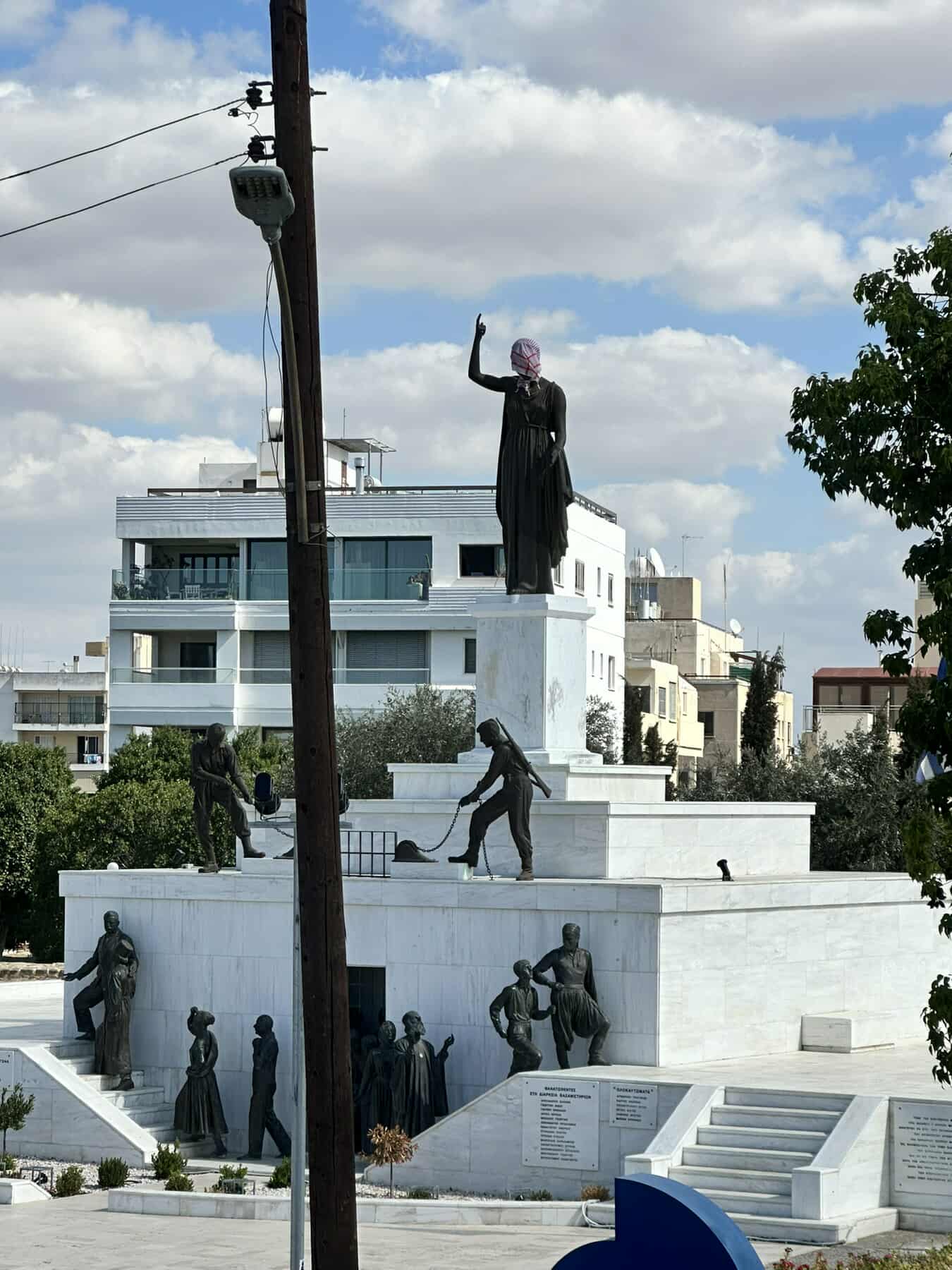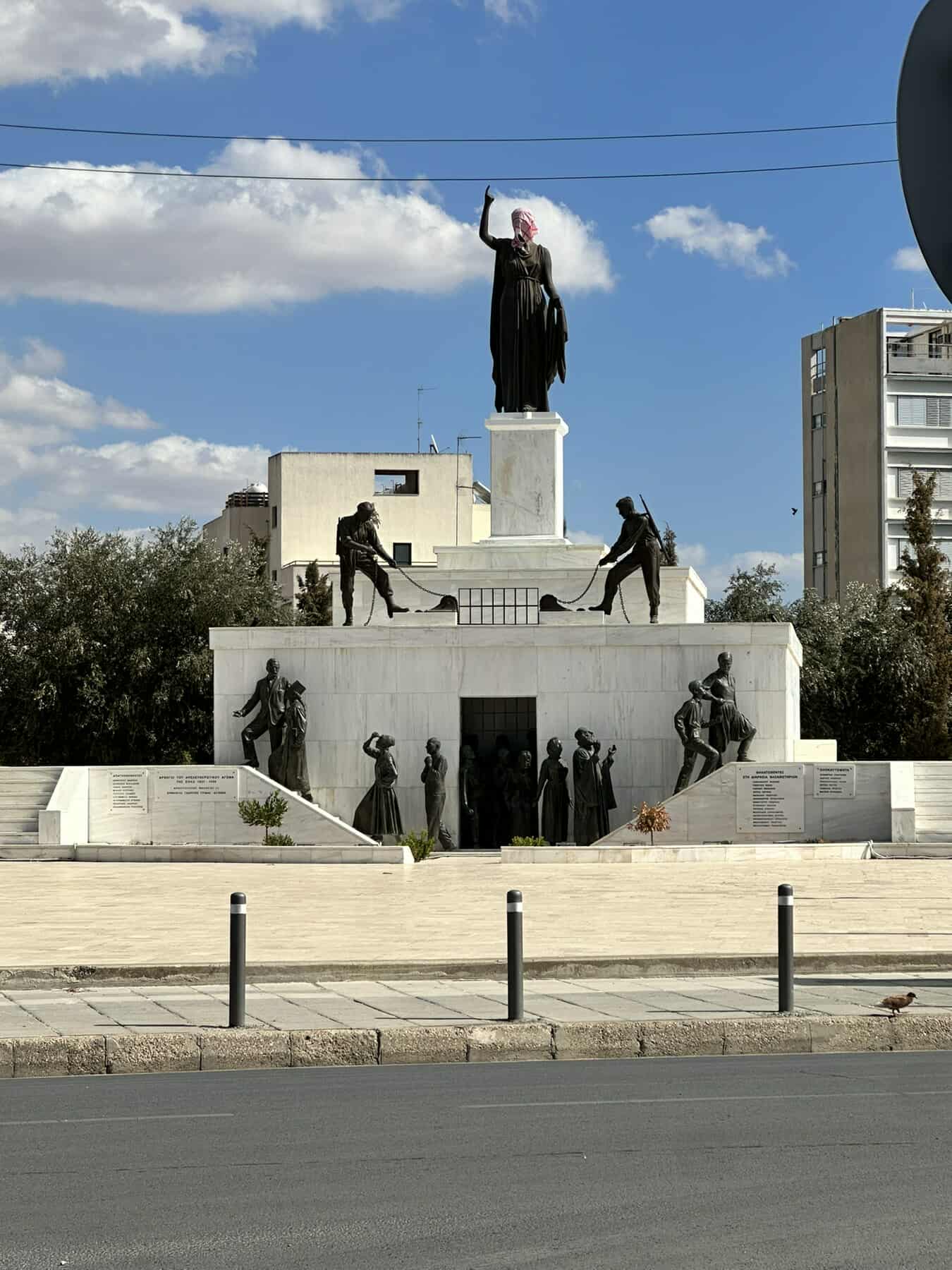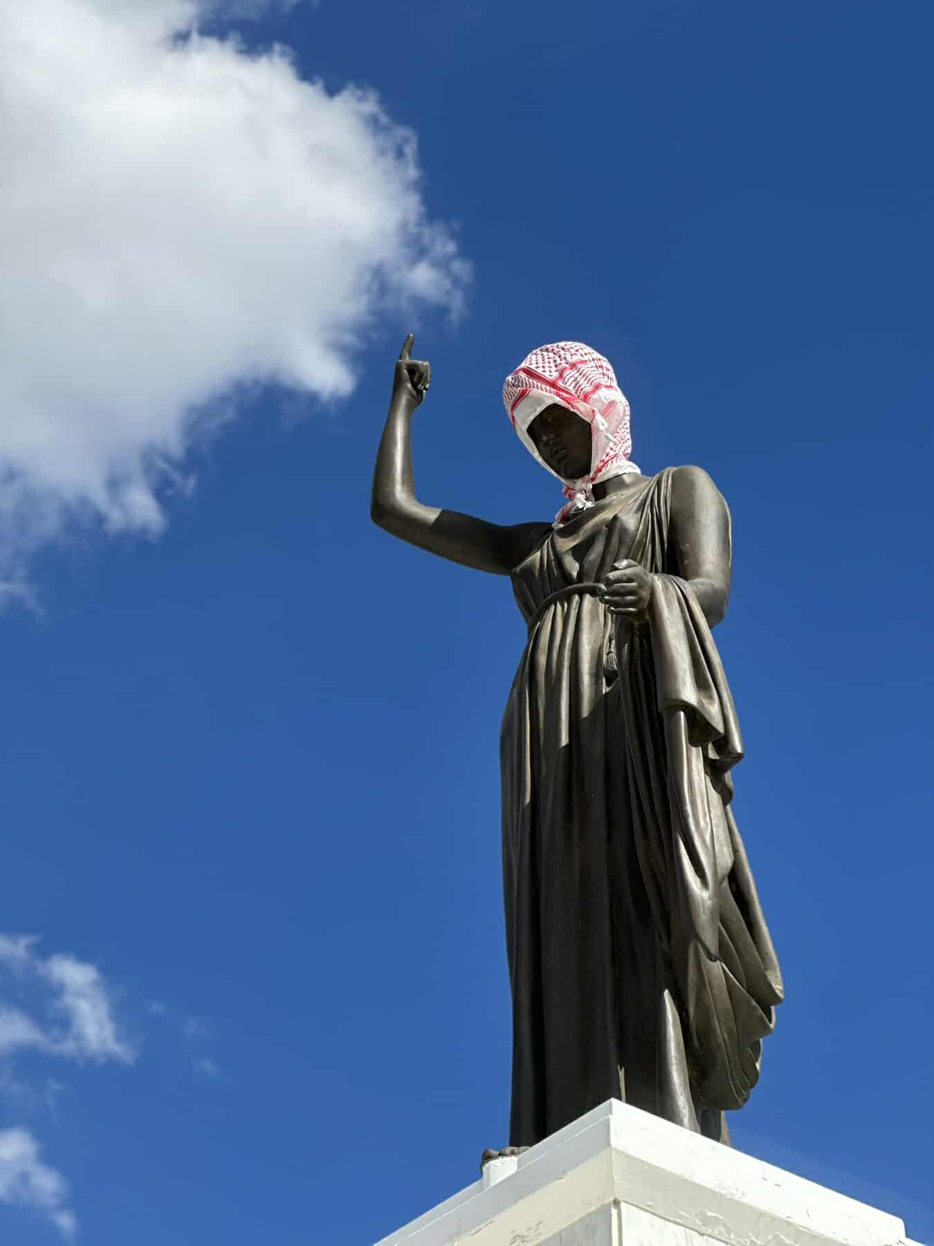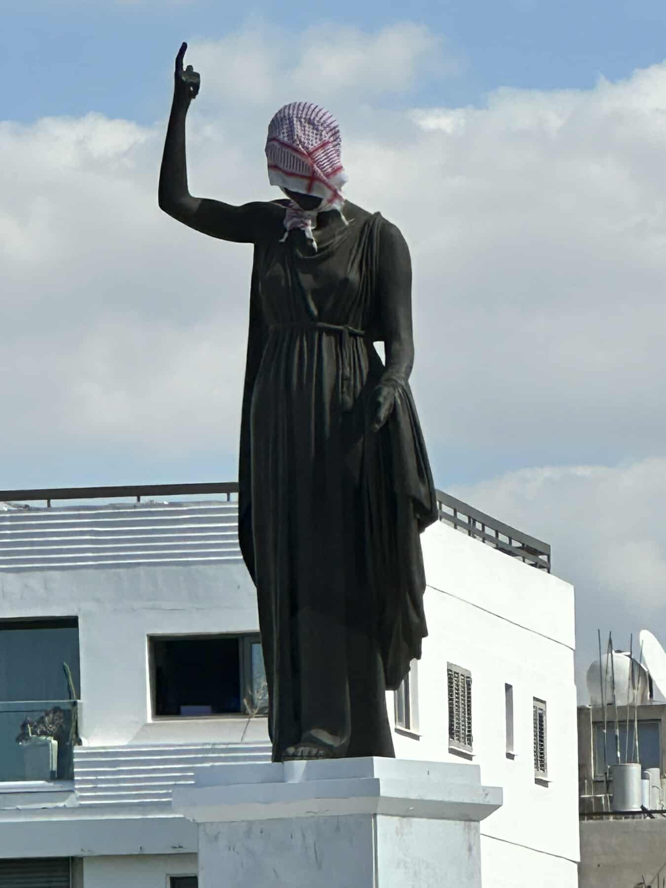 Με μια παλαιστινιακή μαντίλα κάλυψαν άγνωστοι το κεφάλι του Αγάλματος της Ελευθερίας στο κέντρο της επαρχίας Λευκωσίας.
