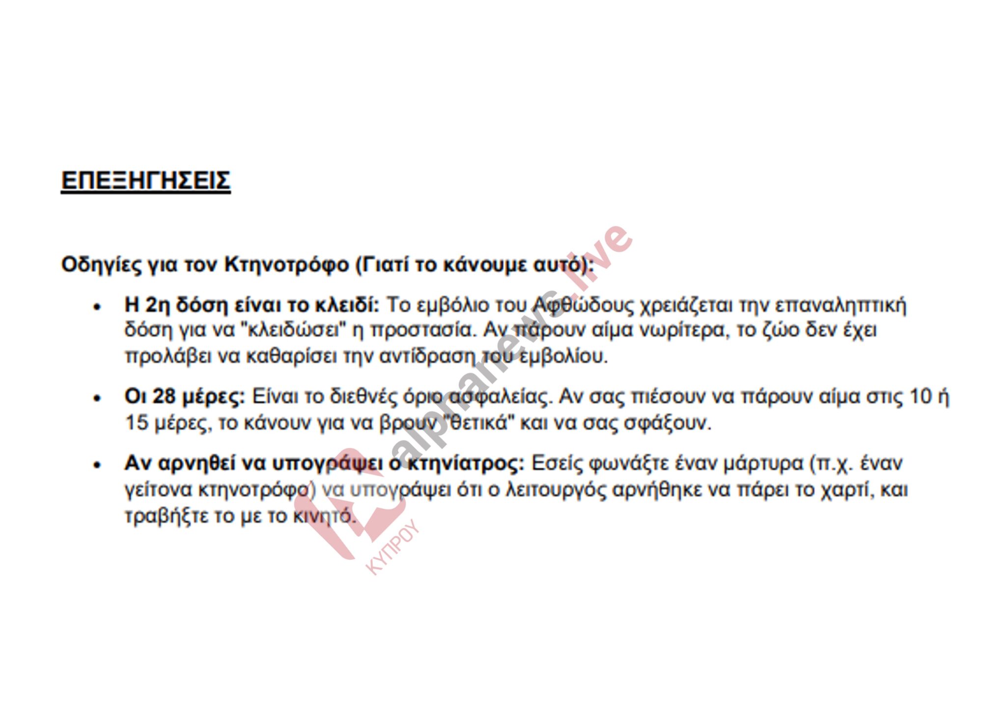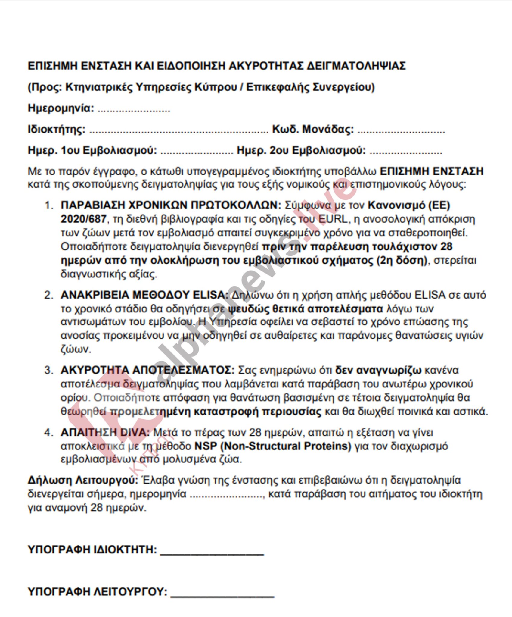 Το έγγραφο το οποίο παρουσιάζουν ως «επίσημη ένσταση και ειδοποίηση ακυρότητας δειγματοληψίας» οι κτηνοτρόφοι εξασφάλισε το AlphaNewsLive και όπως φαίνεται, υποστηρίζον ότι δεν μπορεί να διενεργηθεί δειγματοληψία αν δεν παρέλθουν τουλάχιστον 28 ημέρες από την ολοκλήρωση της δεύτερης δόσης του εμβολιασμού.