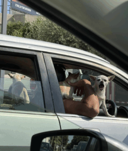 Ο ένας μάλιστα, είναι στον ώμο του οδηγού, ενώ δεύτερος βρίσκεται στα πόδια του, έχοντας το κεφάλι έξω από το παράθυρο.