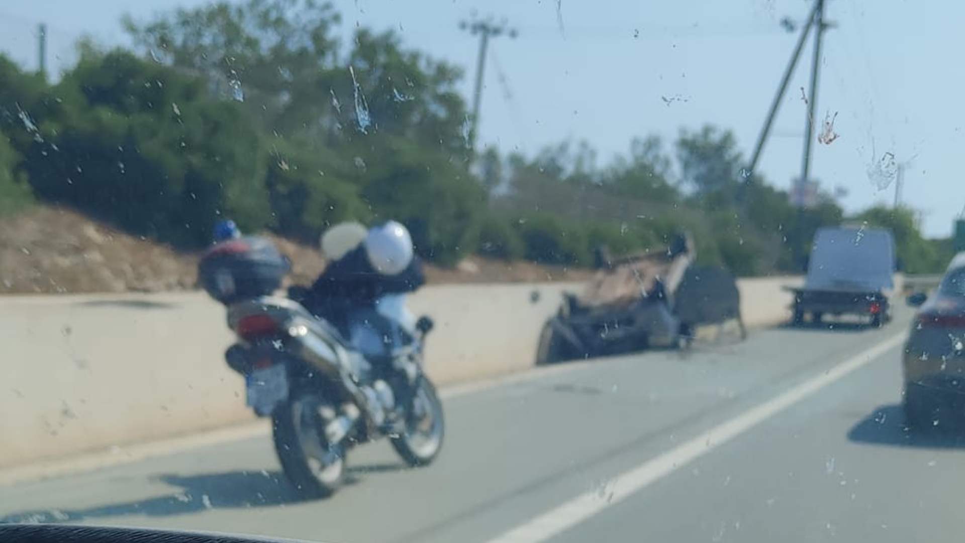 Κάτω από συνθήκες που διερευνώνται, όχημα ανατράπηκε και ακινητοποιήθηκε στο τσιμεντένιο κιγκλίδωμα του αυτοκινητόδρομου.