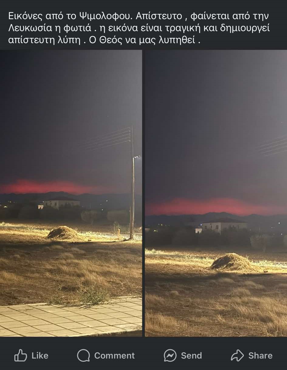 Εικόνες που αναρτήθηκαν στα μέσα κοινωνικής δικτύωσης καταδεικνύουν ότι οι φλόγες διακρίνονται από την επαρχία Λευκωσίας και συγκεκριμένα από το χωριό Ψημολόφου.