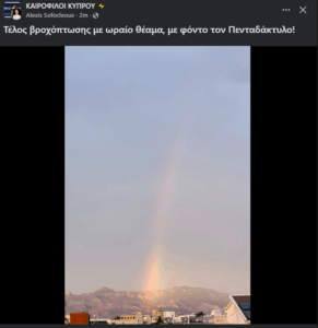 Κάπως ποιητικό, ίσως και ρομαντικό! Ένα ουράνιο τόξο έκανε την εμφάνισή του στον ουρανό της Λευκωσίας έπειτα από τους σεισμούς και τις καταρρακτώδεις βροχές που προκάλεσαν προβλήματα κι αναστάτωσαν τους κάτοικους του νησιού.