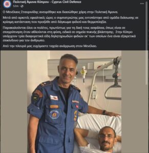 Για το περιστατικό αναφέρεται σε ανάρτησή της η Πολιτική Άμυνα, σημειώνοντας ότι ο Μενέλαος Σταυρινίδης ανευρέθηκε και διασώθηκε χάρη στην Πολιτική Άμυνα.