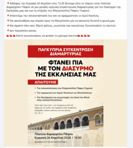 Η εκδήλωση διαμαρτυρία θα πραγματοποιηθεί την Κυριακή 26 Απριλίου 2026 στις 15:30, με συγκέντρωση στην πλατεία Δημαρχείου Πάφου. Ακολούθως, οι παρευρισκόμενοι θα πορευτούν προς την Μητρόπολη Πάφου, όπου θα αξιώσουν τη διατήρηση την υφιστάμενης εκλογικής διαδικασίας για την ανάδειξη Μητροπολιτών.
