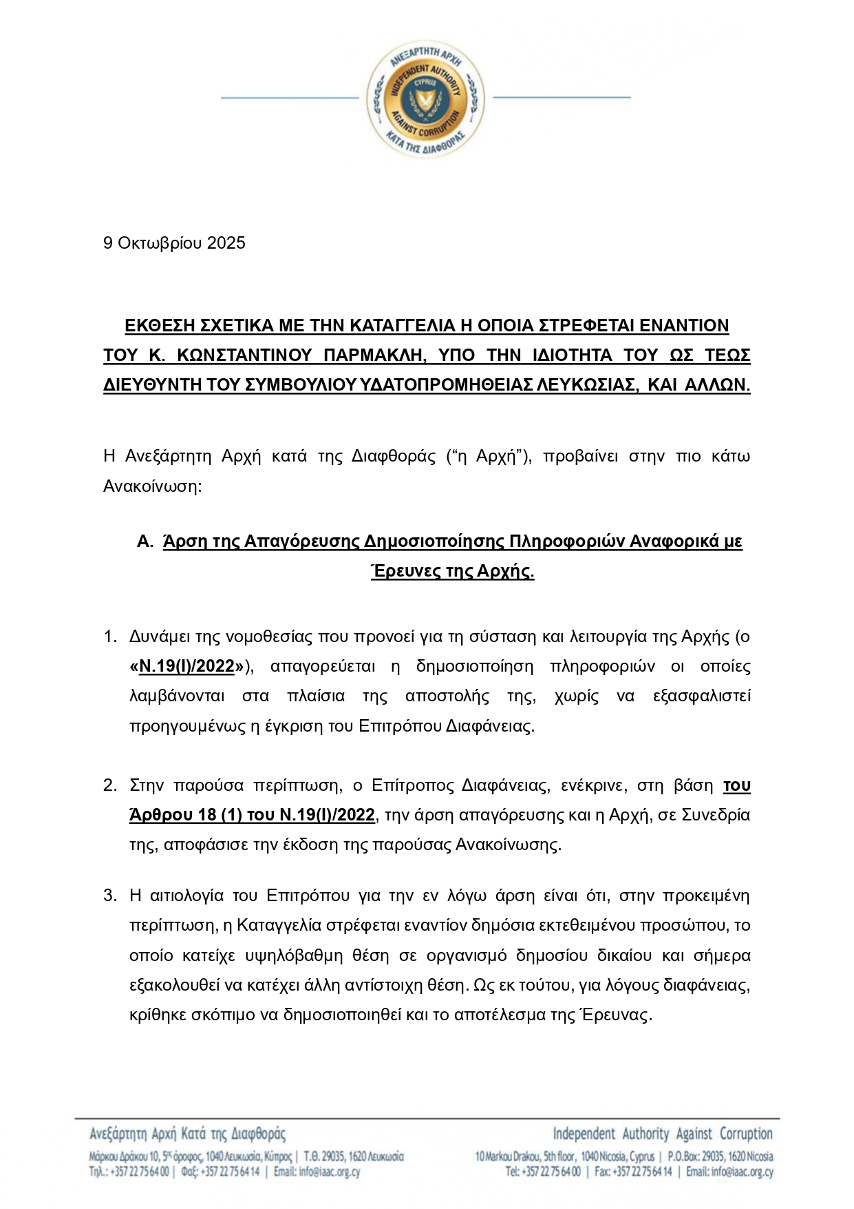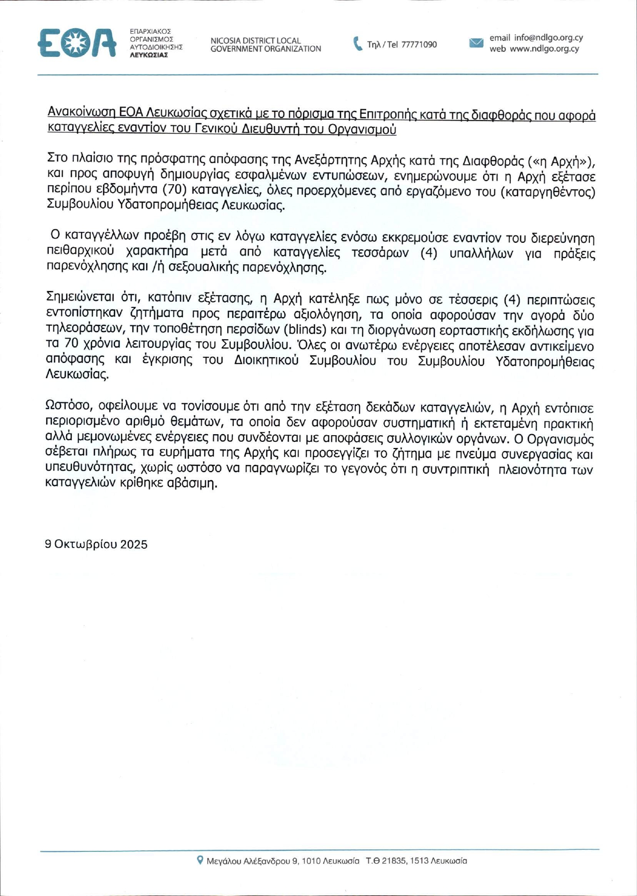 Καταπέλτης κατά του αξιωματούχου του Συμβουλίου Υδατοπρομήθειας Λευκωσίας που κατήγγειλε τον πρώην Διευθυντή του Συμβουλίου Κωνσταντίνο Παρμακλή στην Ελεγκτική Υπηρεσία, είναι η ανακοίνωση που εξέδωσε ο Επαρχιακός Οργανισμός Αυτοδιοίκησης Λευκωσίας μετά το πόρισμα της Αρχής Κατά της Διαφθοράς που διαπιστώνει ενδεχόμενη κατάχρηση εξουσίας και πειθαρχικά αδικήματα.