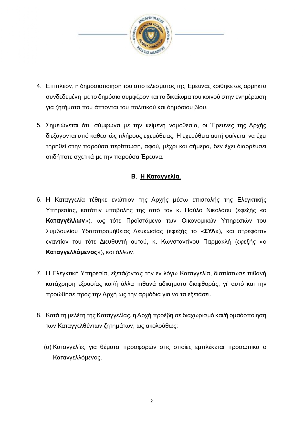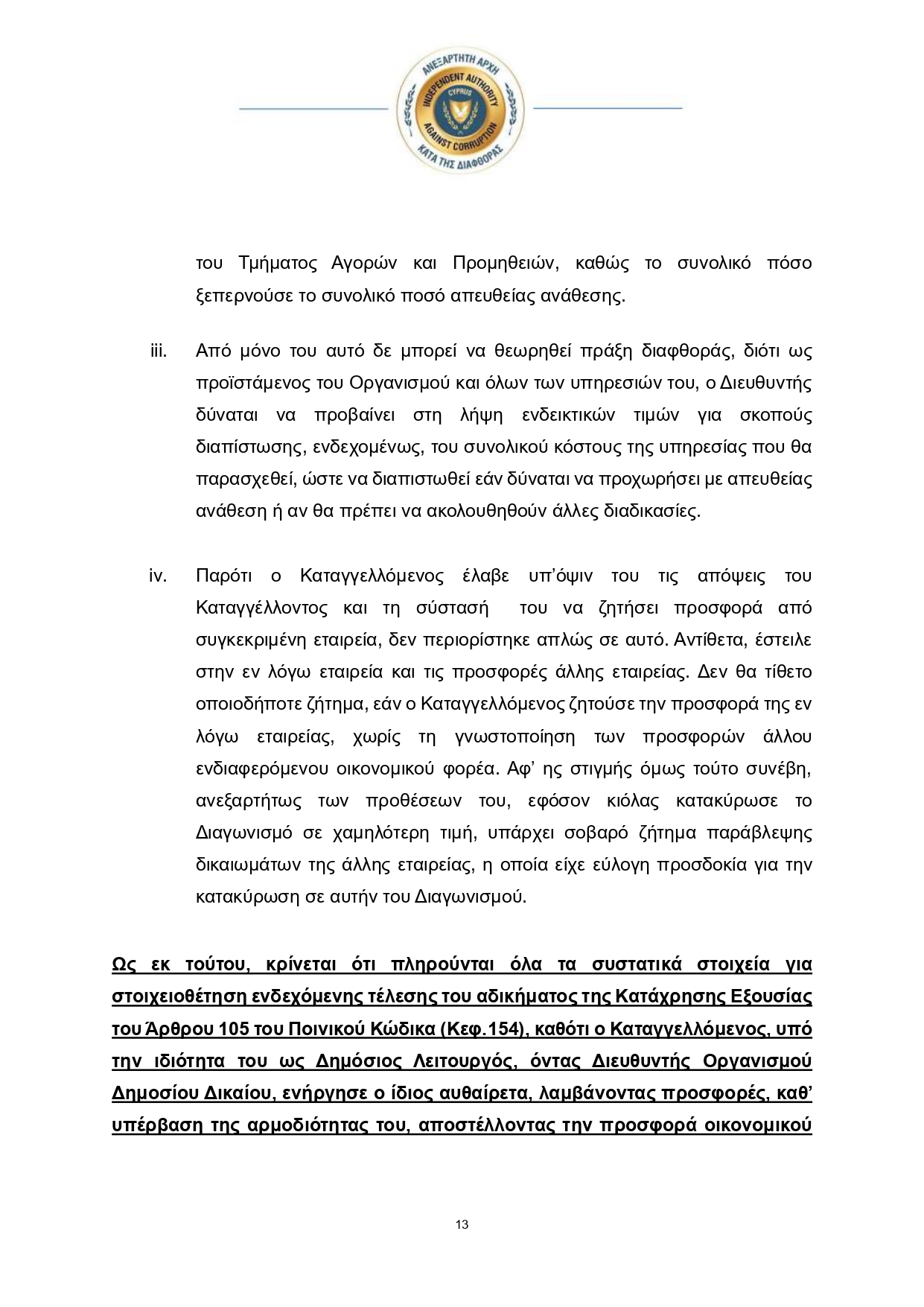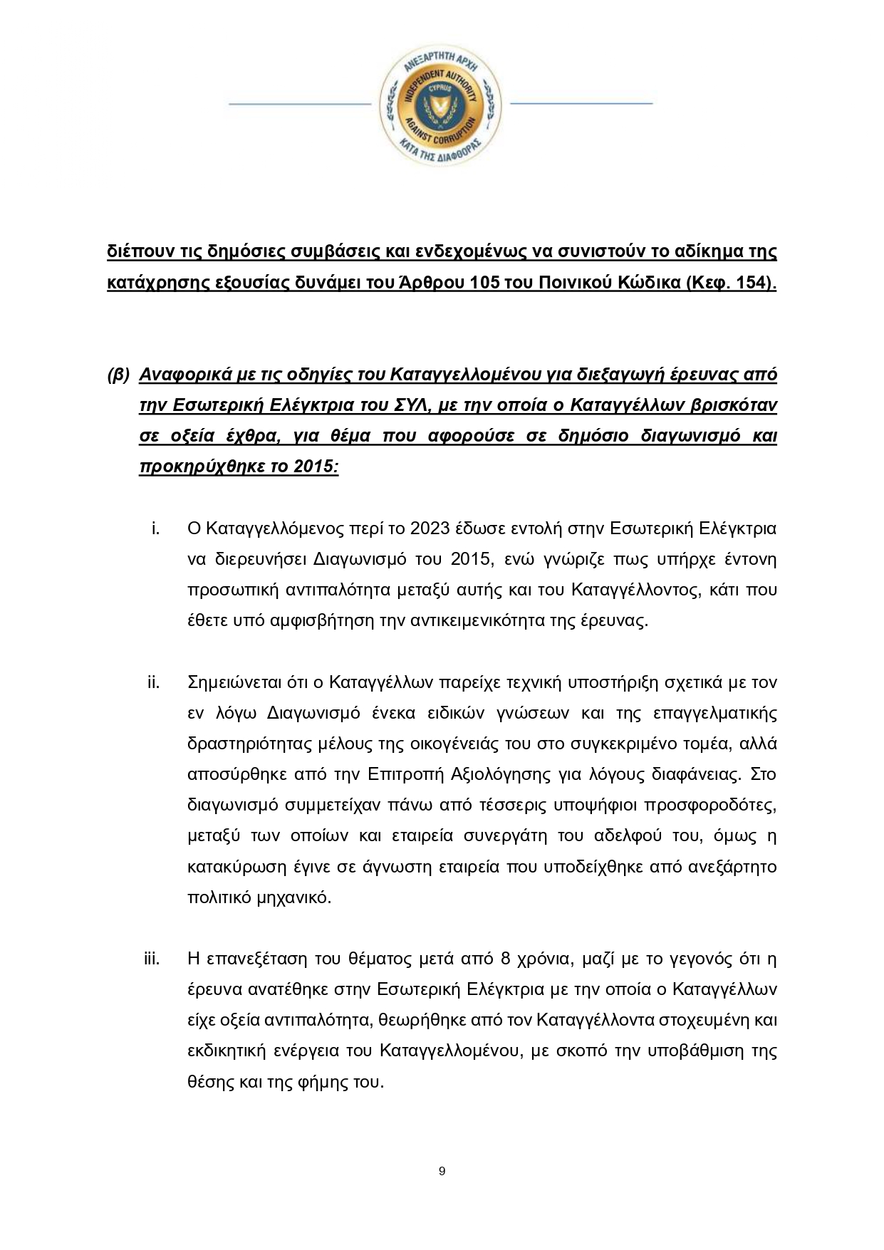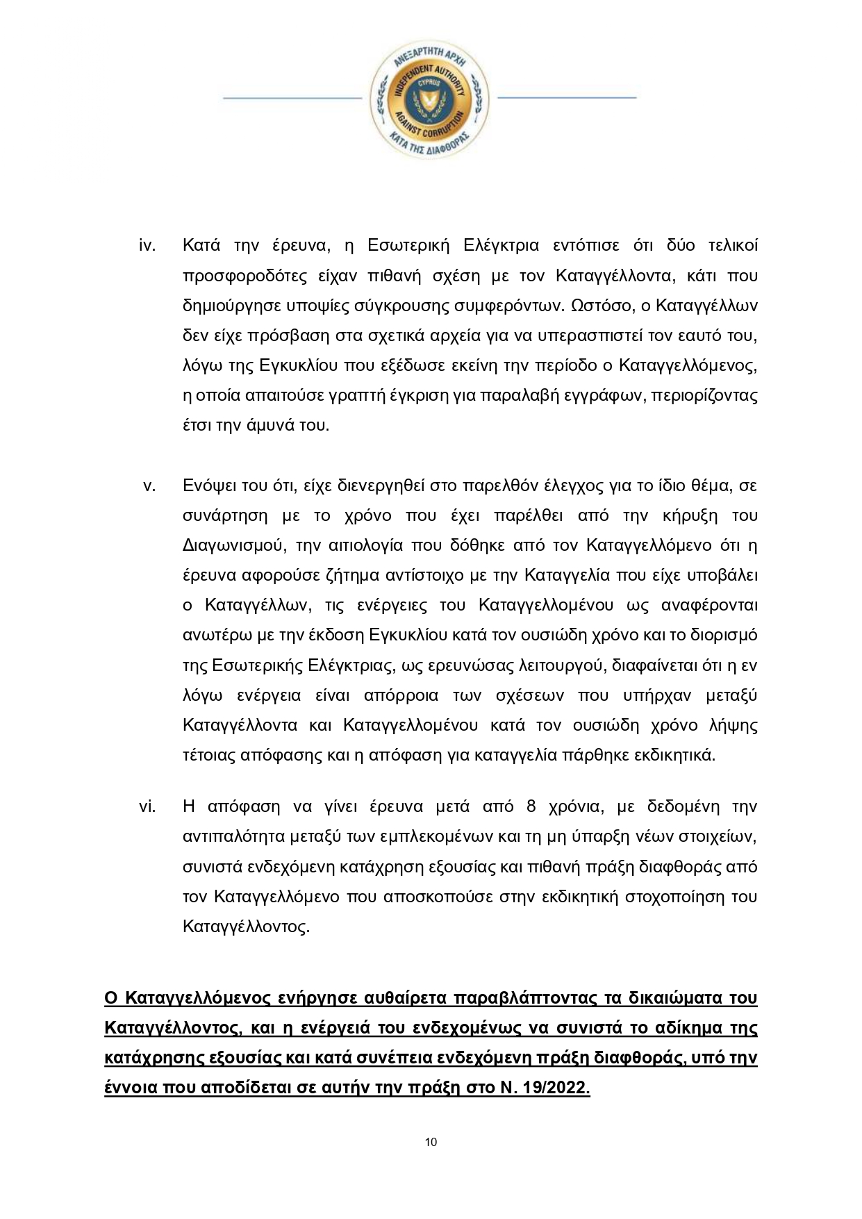 - Ενδεχόμενη διάπραξη του αδικήματος της κατάχρησης εξουσίας από τον Καταγγελλόμενο,