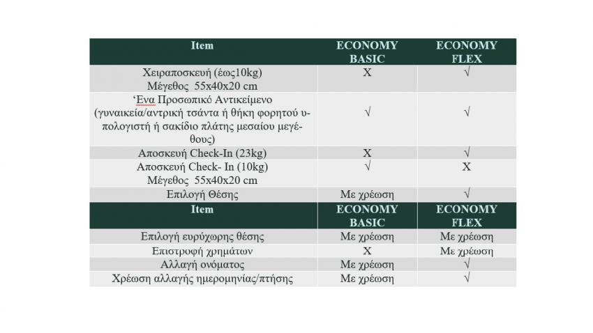 Η Cyprus Airways προσφέρει δύο κατηγορίες ναύλων, Basic και Flex. Η κατηγορία Flex προσφέρει πρόσθετες υπηρεσίες όπως αποσκευή 23kg, επιλογή θέσης κ.λπ., προσφέροντας στους επιβάτες τη δυνατότητα να προσαρμόσουν την ταξιδιωτική τους εμπειρία σύμφωνα με τις προτιμήσεις τους. Η εταιρεία ανακοίνωσε νέα βελτιωμένη πολιτική για τις αποσκευές, η οποία θα επηρεάσει τους επιβάτες που επιλέγουν την κατηγορία ναύλων basic και θα ισχύει από τις 31 Μαρτίου 2019. Σύμφωνα με τη νέα πολιτική για τις αποσκευές, οι κάτοχοι basic εισιτηρίων θα μπορούν να κάνουν check-in μία χειραποσκευή 10 κιλών, προσφέροντας τους ένα πιο άνετο ταξίδι, χωρίς να χρειάζεται να μεταφέρουν τη χειραποσκευή τους στο αεροσκάφος. Όλοι οι επιβάτες επιτρέπεται να έχουν μαζί τους στο αεροσκάφος ένα προσωπικό αντικείμενο (γυναικεία/αντρική τσάντα ή θήκη φορητού υπολογιστή ή σακίδιο πλάτης μεσαίου μεγέθους), που μπορούν να τοποθετήσουν κάτω από το μπροστινό τους κάθισμα. Αυτή η νέα πολιτική αποσκευών θα είναι προς όφελος όλων των επιβατών της Cyprus Airways, καθώς θα μειώσει τις καθυστερήσεις επιβίβασης.