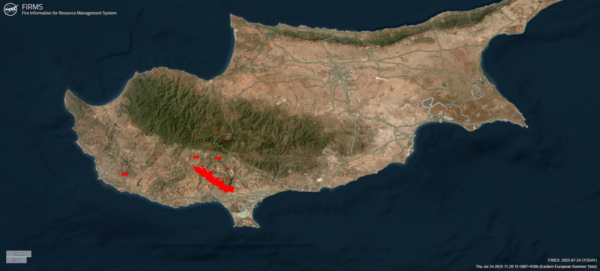 Ζουμάροντας στην περιοχή της Κύπρου, κατά τη χθεσινή μέρα ένα μεγάλο κομμάτι στην ορεινή Λεμεσό και νοτιότερα, καταγράφεται με κόκκινα στίγματα. Είναι τα σημεία όπου υπήρχαν τα φονικά ενεργά μέτωπα.